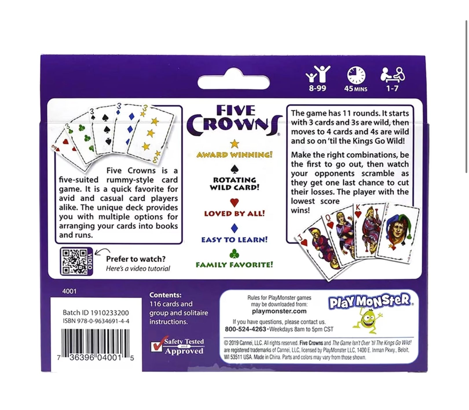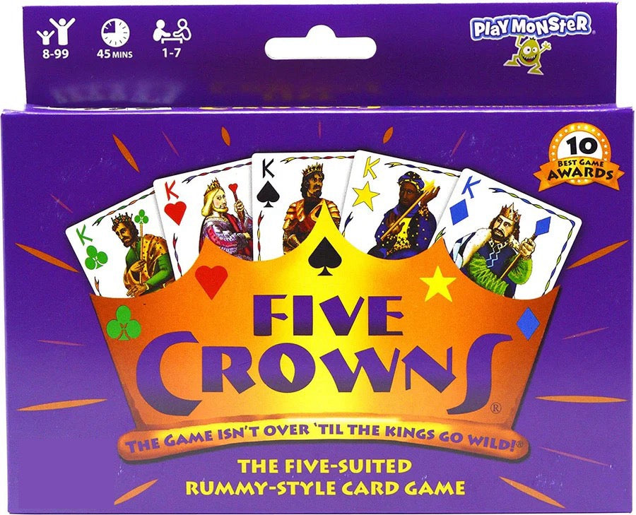 Five Crowns is rummy with a five-suited deck and a twist. The set collection aspect of rummy is basically the same, with groups of three cards in either runs or denominations making a valid meld. The twist is that in each hand the number of cards required to create a meld increases, from three cards in the first hand to thirteen in the last. The game, therefore, consists of eleven hands.