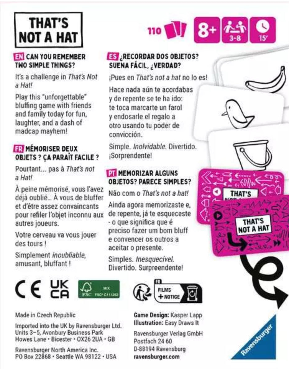 Wrap and regift objects in this deceptively simple card game of having the world’s best memory... or convincing everyone you do! Was that gift a hat, a bucket, or a traffic cone?! Play this “unforgettable” bluffing game with friends and family for fun, laughter, and a dash of madcap mayhem.