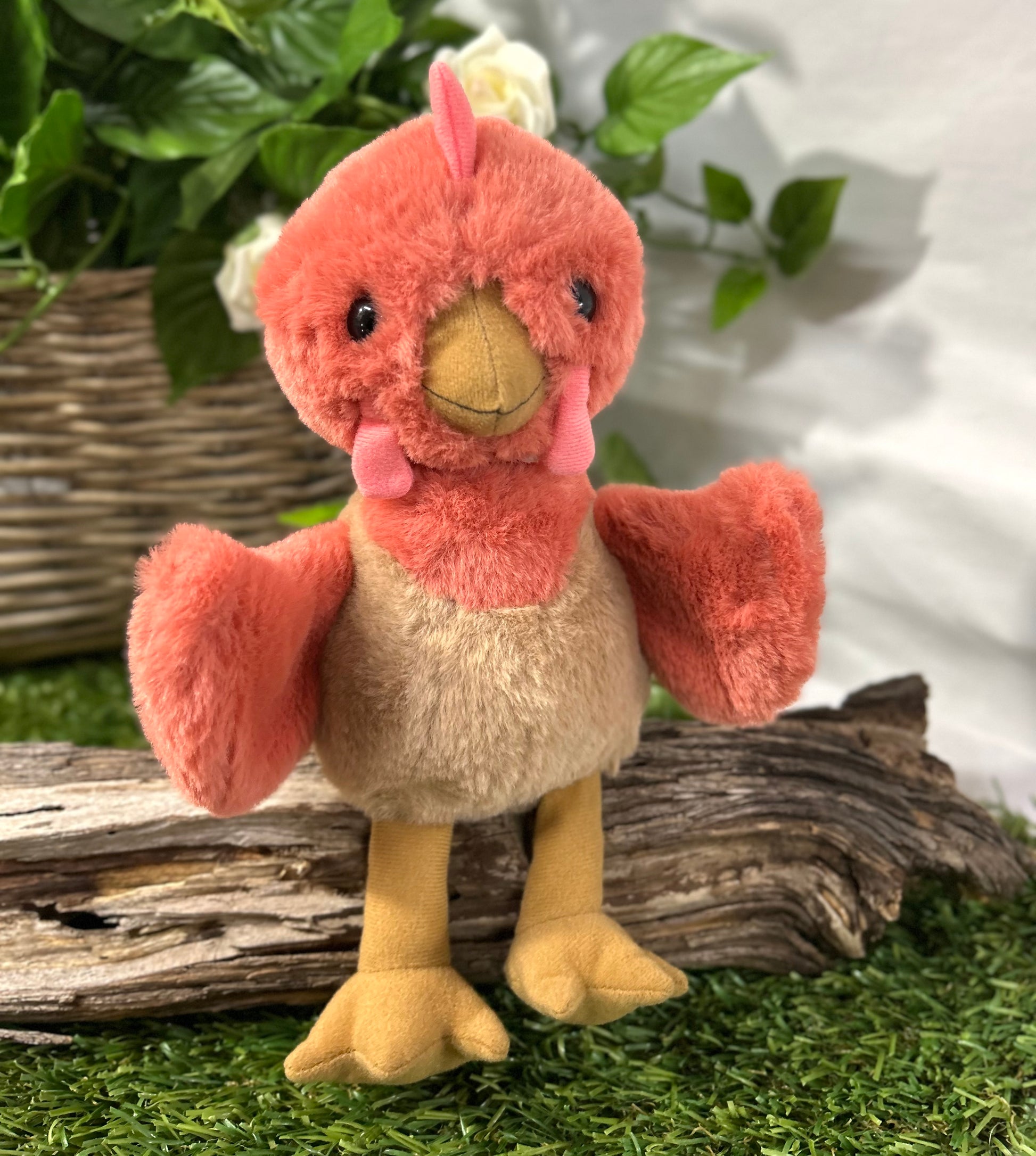 Clucky Chicken is a cheerful and cuddly character, with a soft, plush coat in marmalade orange and a playful personality that brightens every day. With its flappy wings and friendly expression, this chicken brings a touch of farmyard fun to playtime and bedtime snuggles alike.