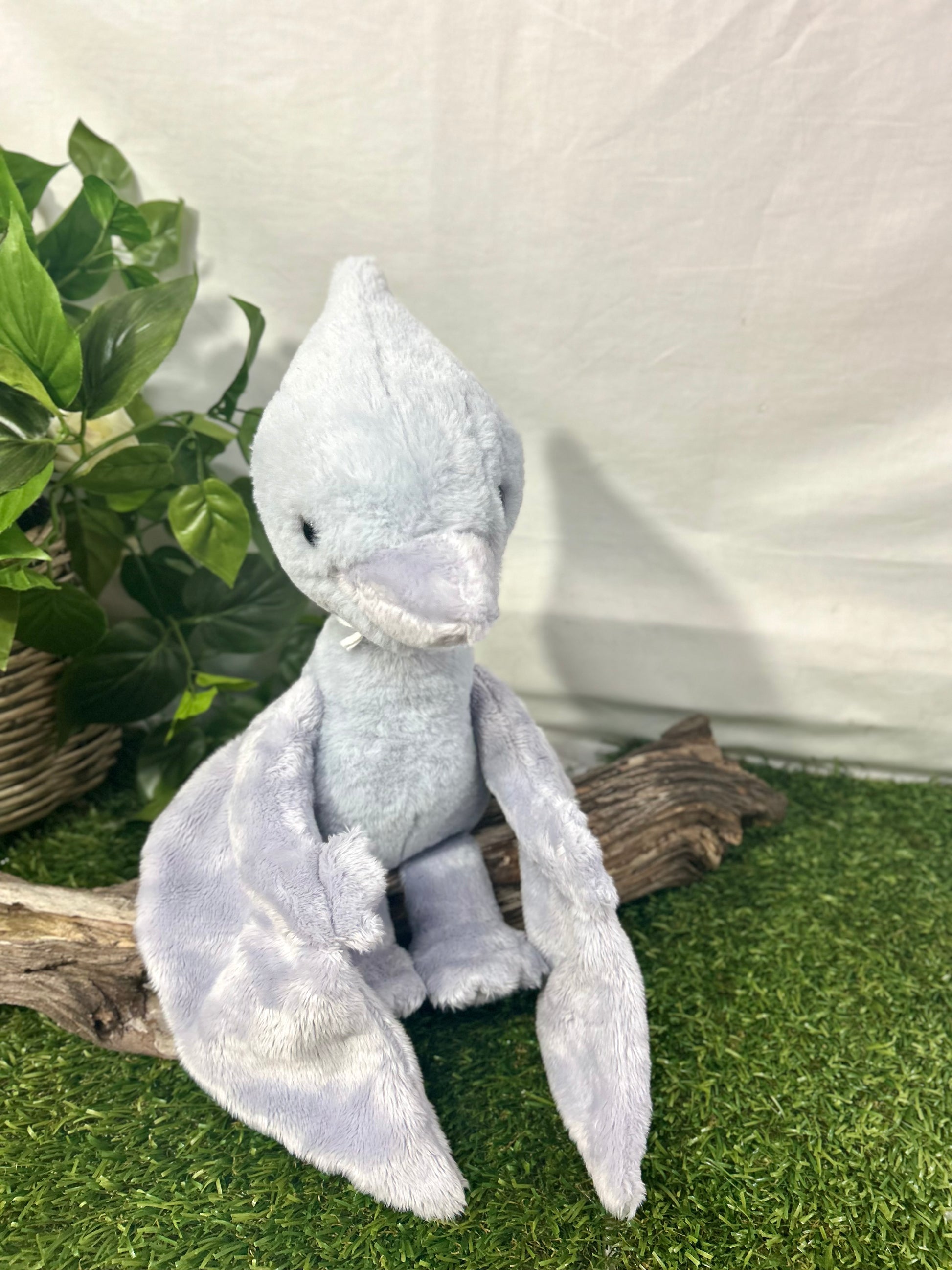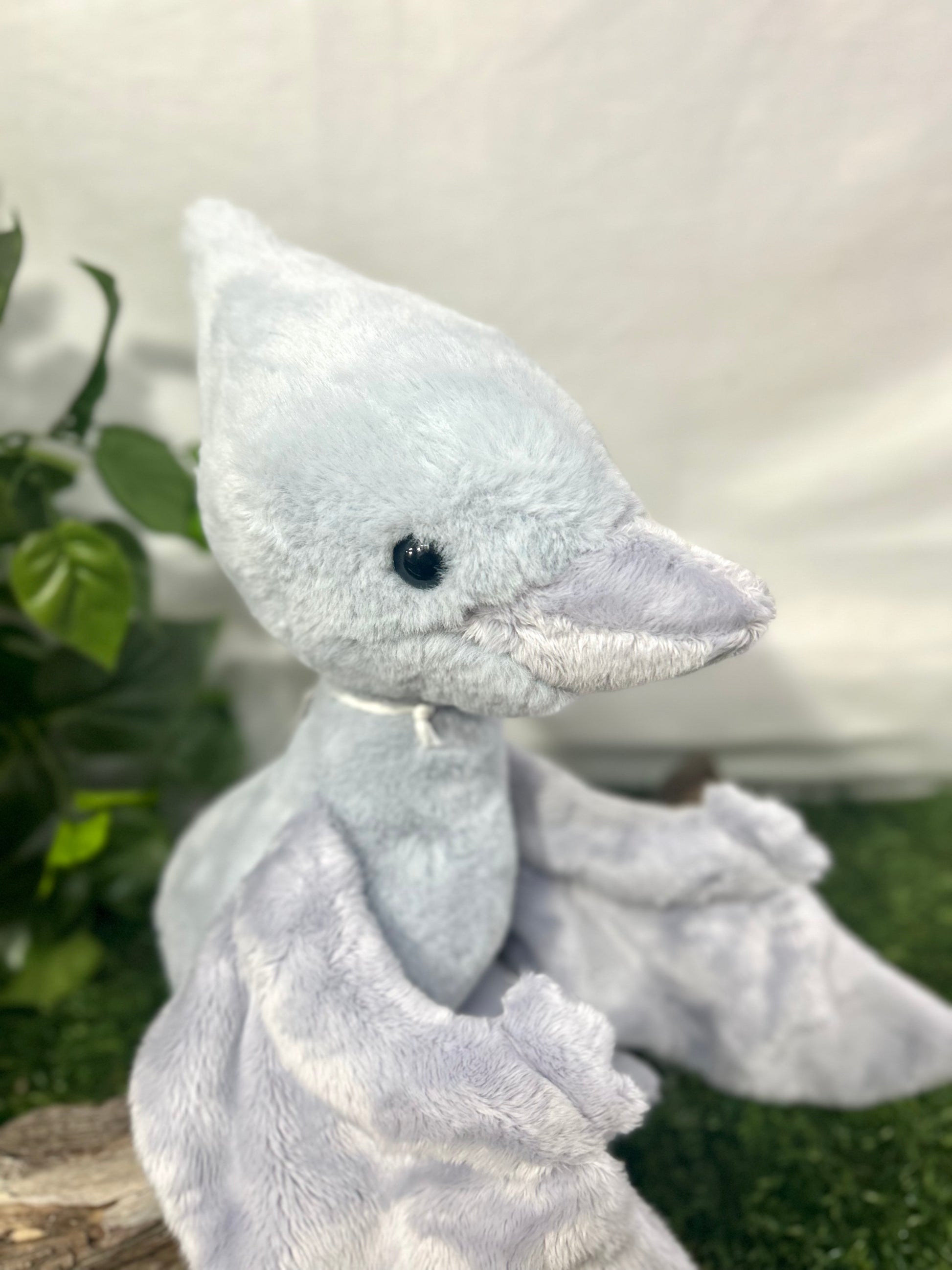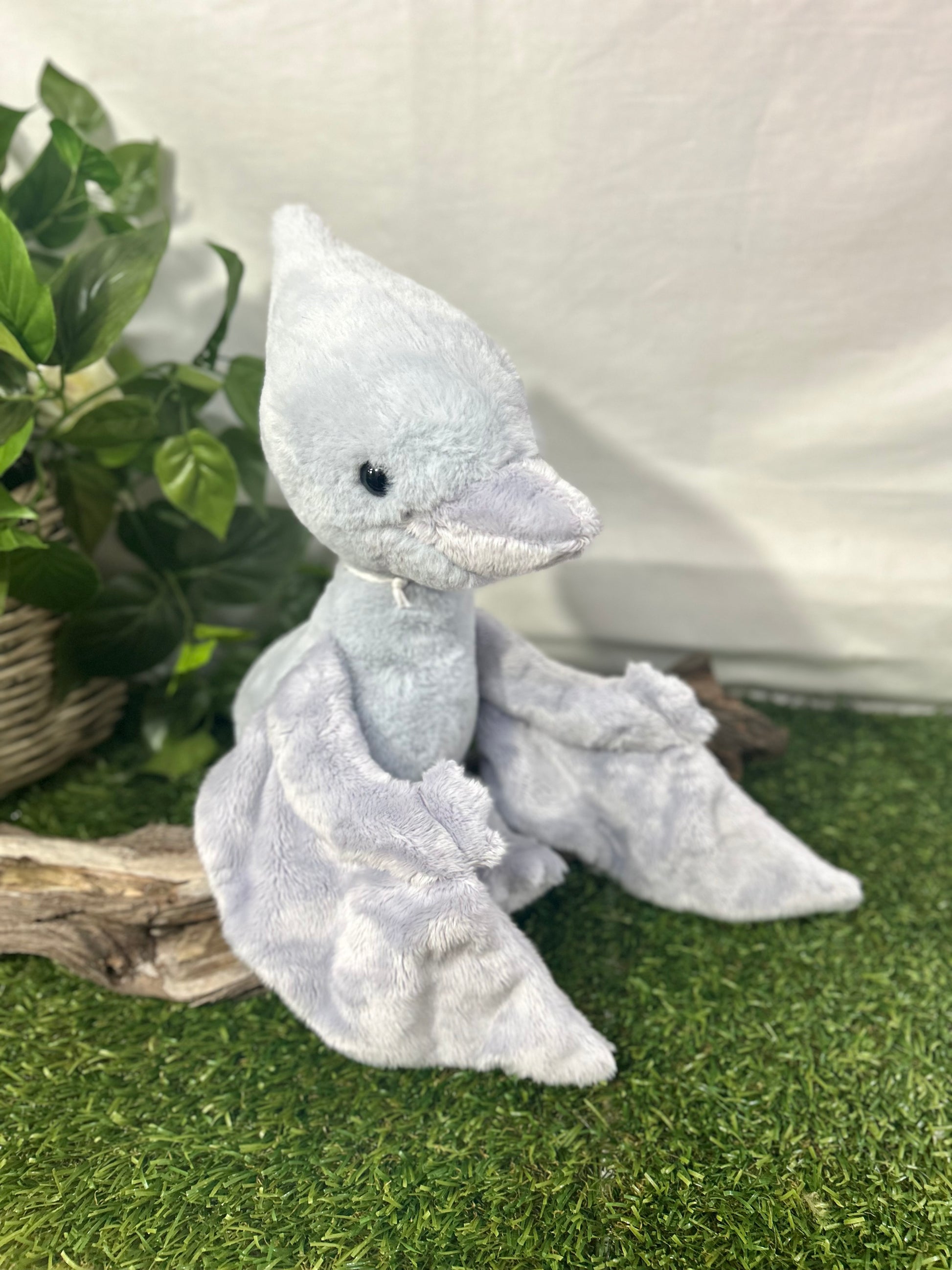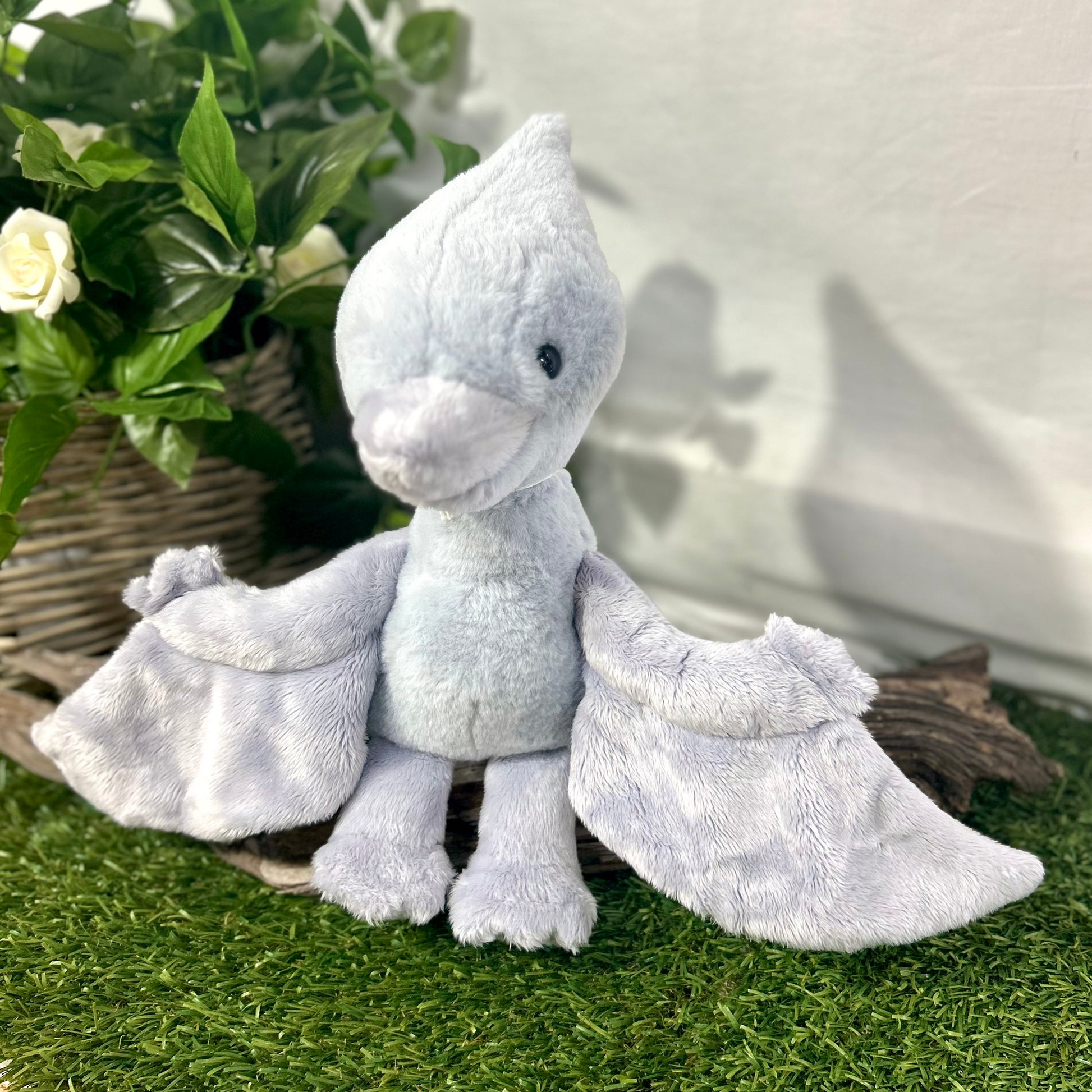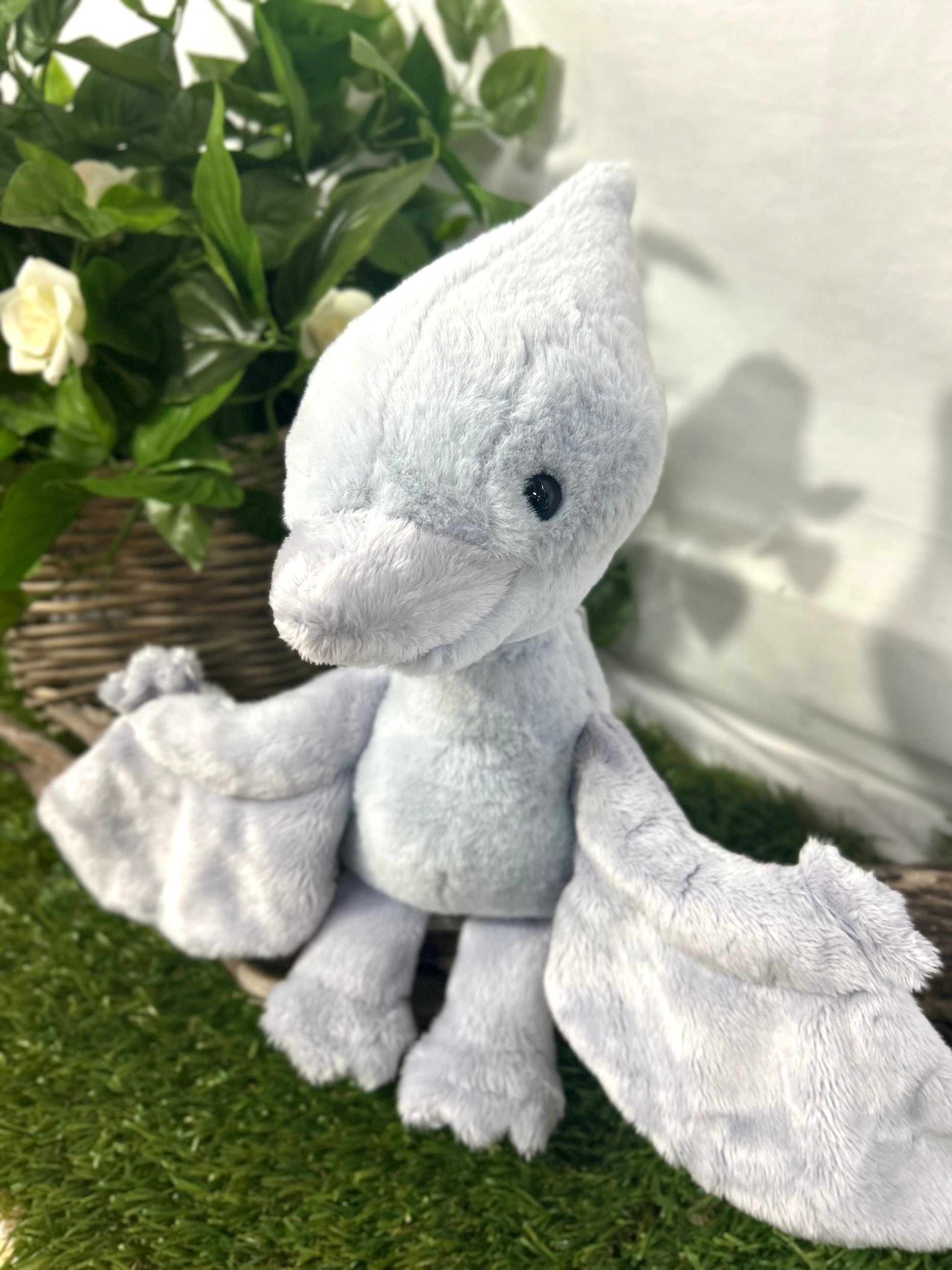 Wings Pterodactyl in cloudy grey is a prehistoric pal with soft, wide swooping wings and a gentle seated pose. This soaring dino is always ready to glide into story time or take off on imaginative adventures.