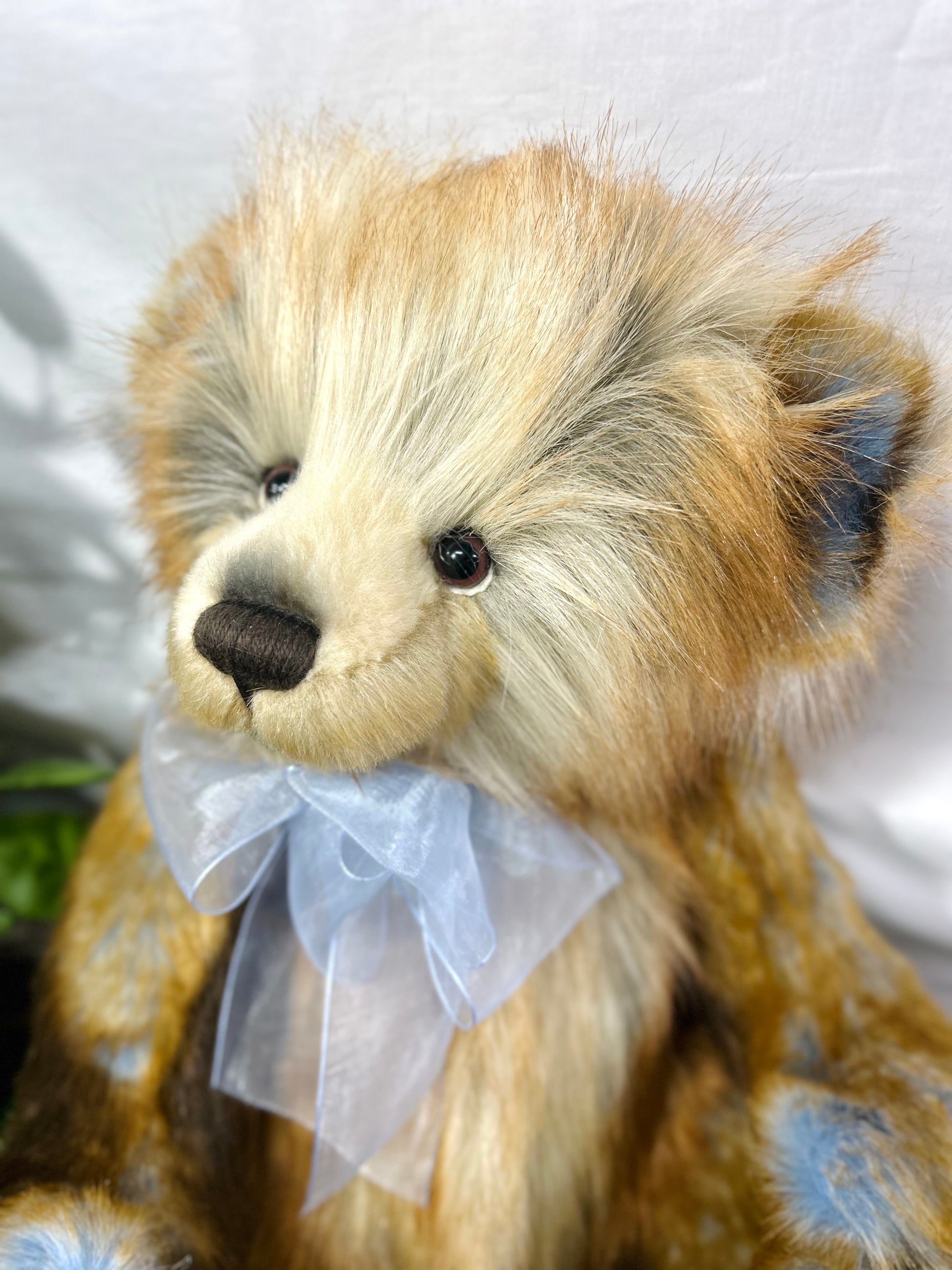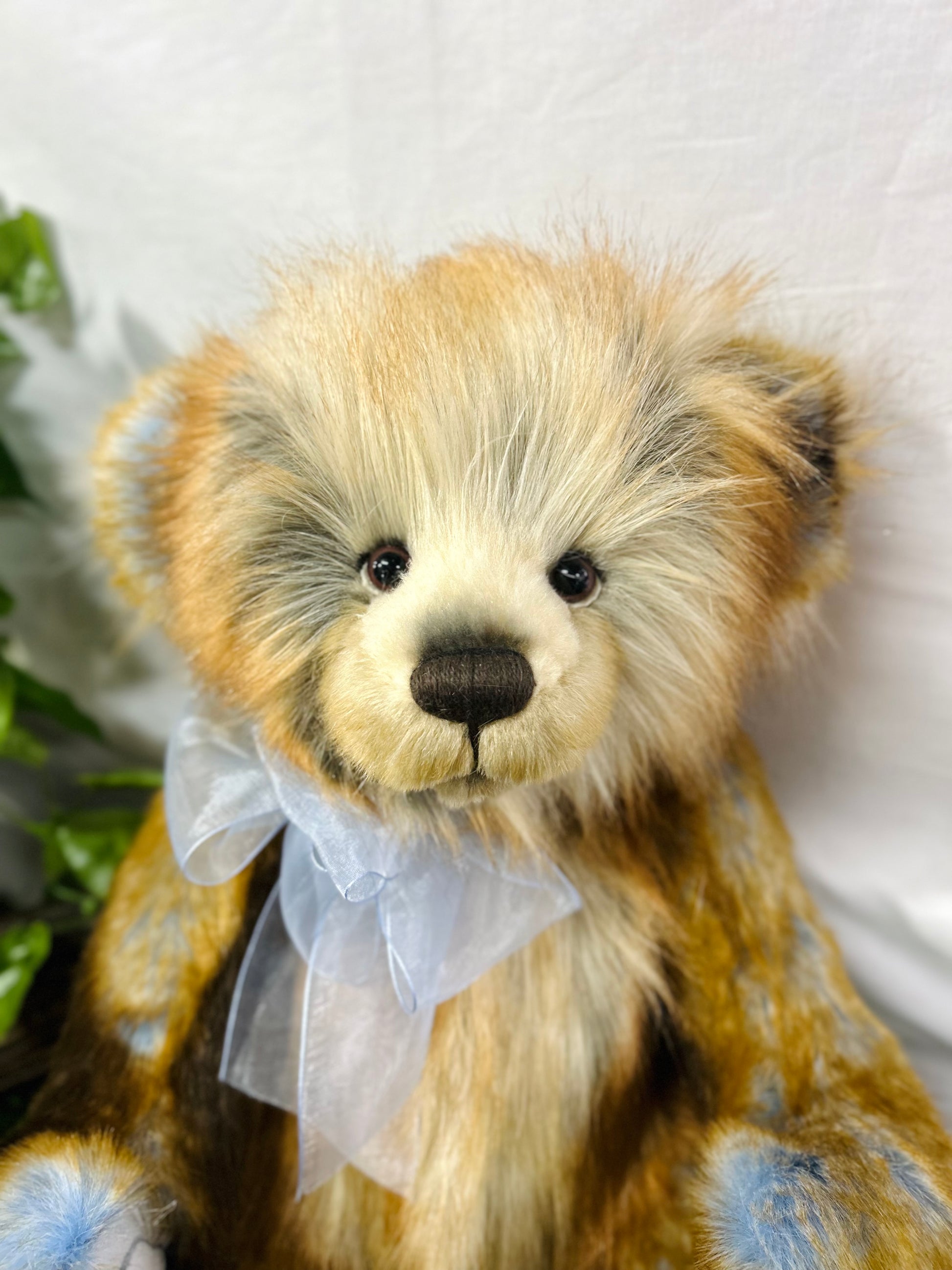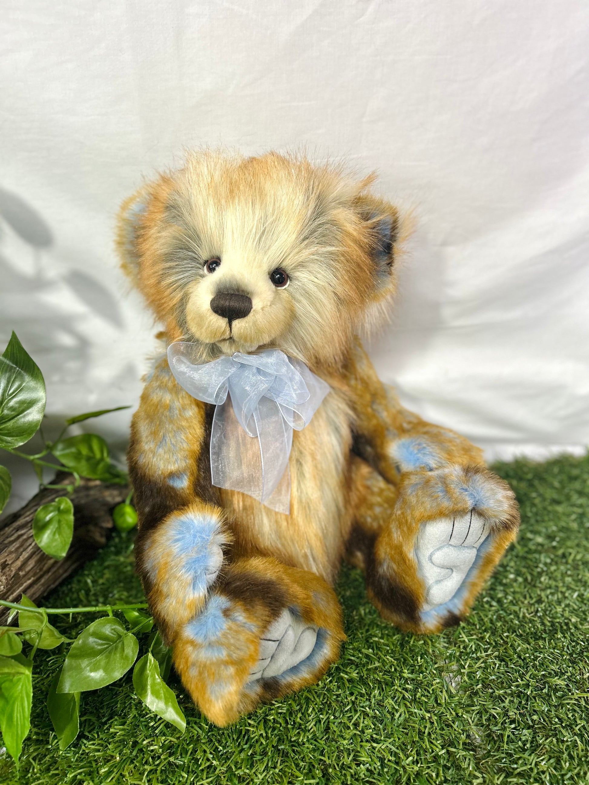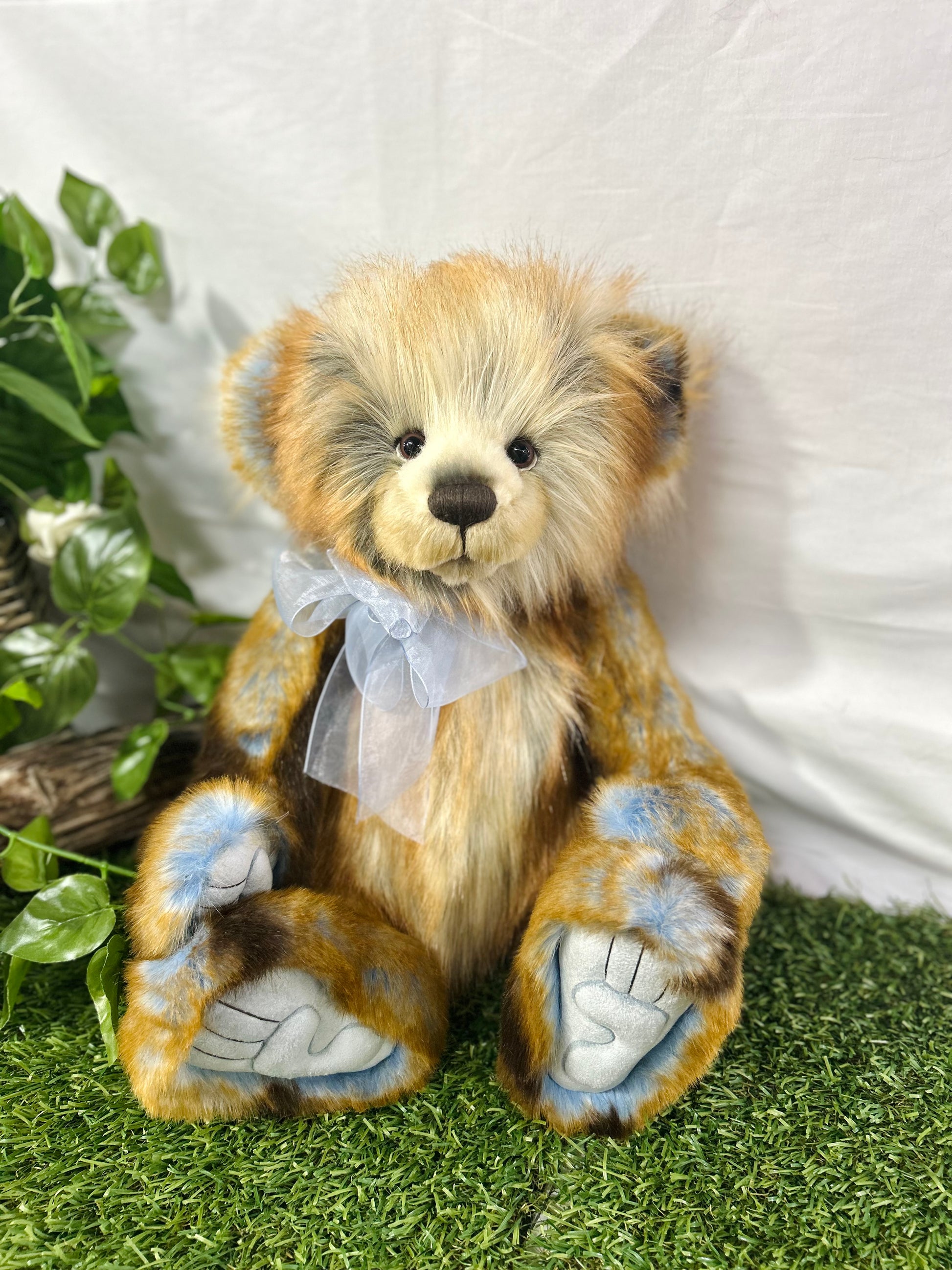 Shhh, Fantasia is a special surprise, part of our 2024 Secret Collection! This a-paw-able bear is crafted from ultra-soft medium-pile plush in various shades of brown, accented by stunning tufts of blue. Fantasia has sculpted paw pads with hand-embroidered tickly toe detailing and wears a blue organza bow around his neck which wonderfully compliments the blue in his fur
