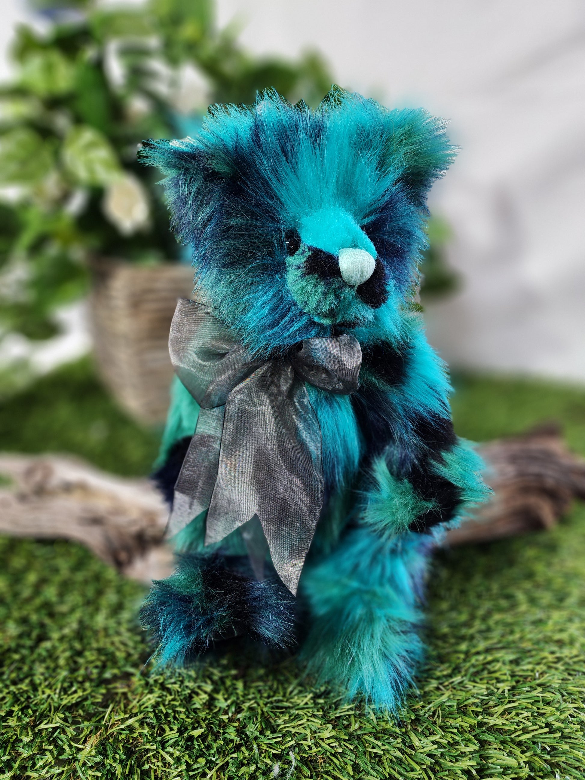If you were lucky enough to get Wizard and the magic hat ... what a gorgeous addition this would make. The strength of teal with patches of black are striking, finished off with a black organza bow.