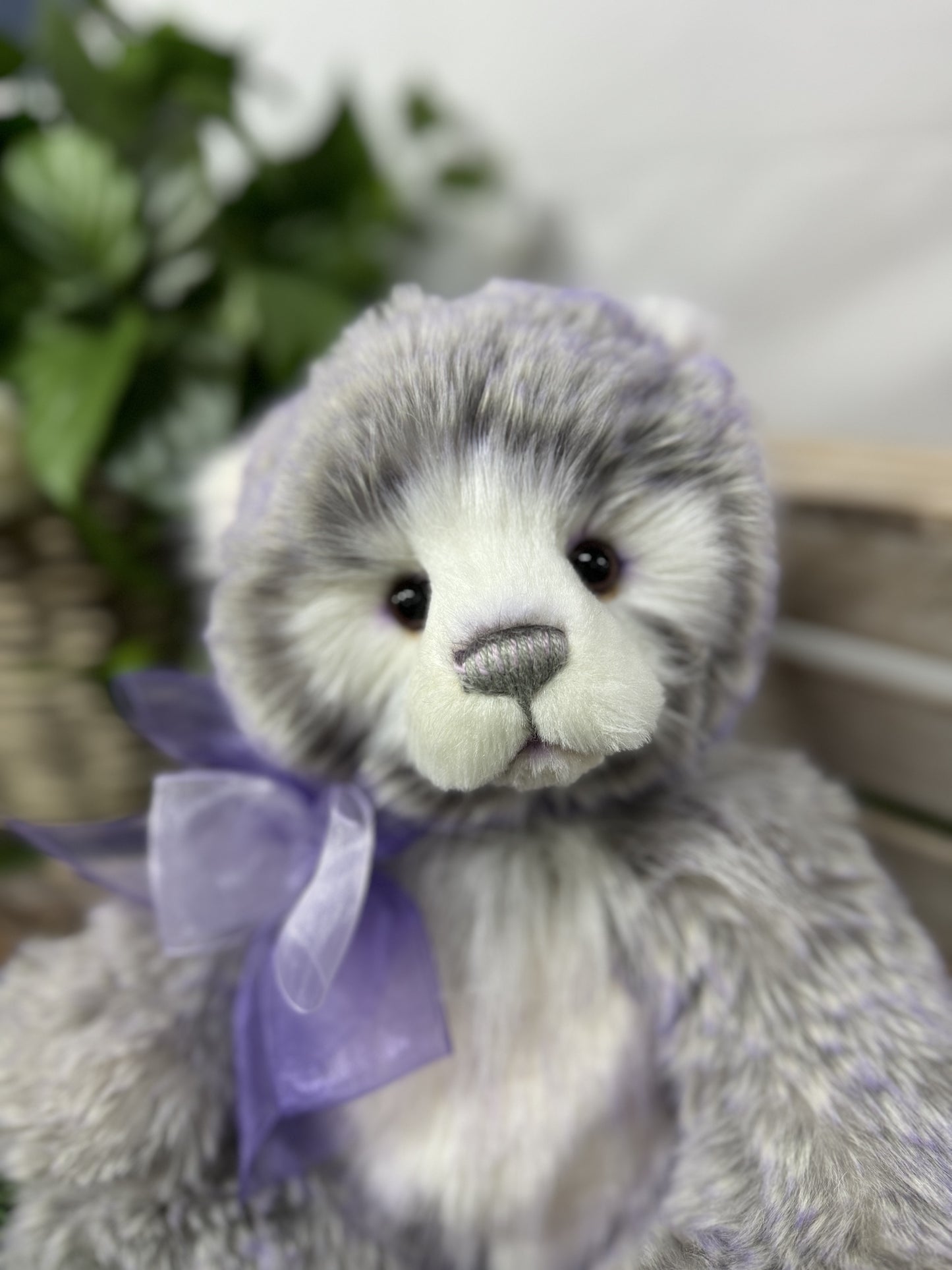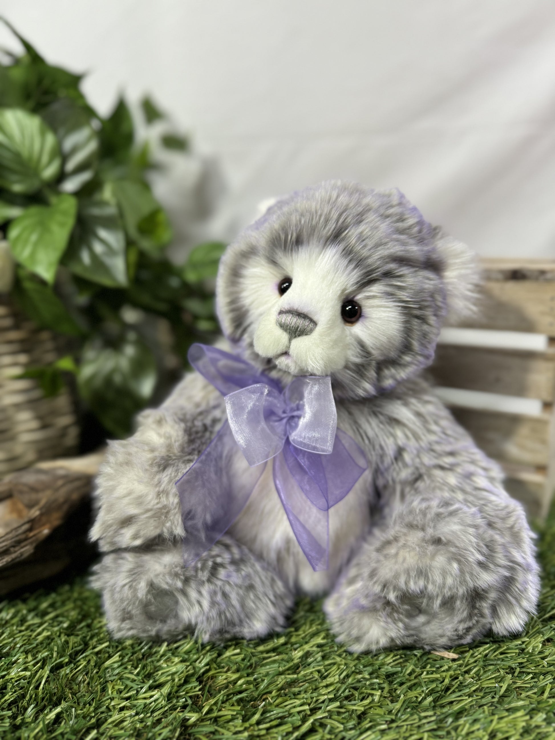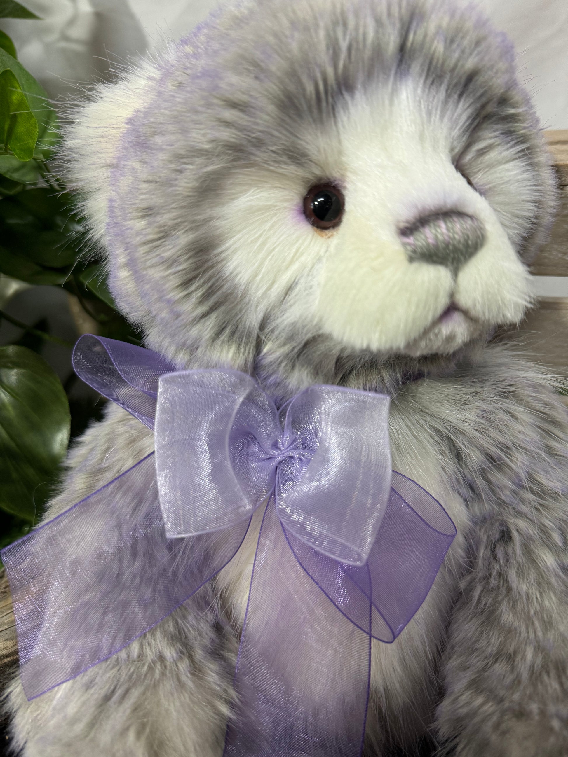 Doesn't this bear dare you to touch. The silky smooth luscious fur with a grey base and lilac tipping, white little ears and the cutest toes, introduces you to Meghan