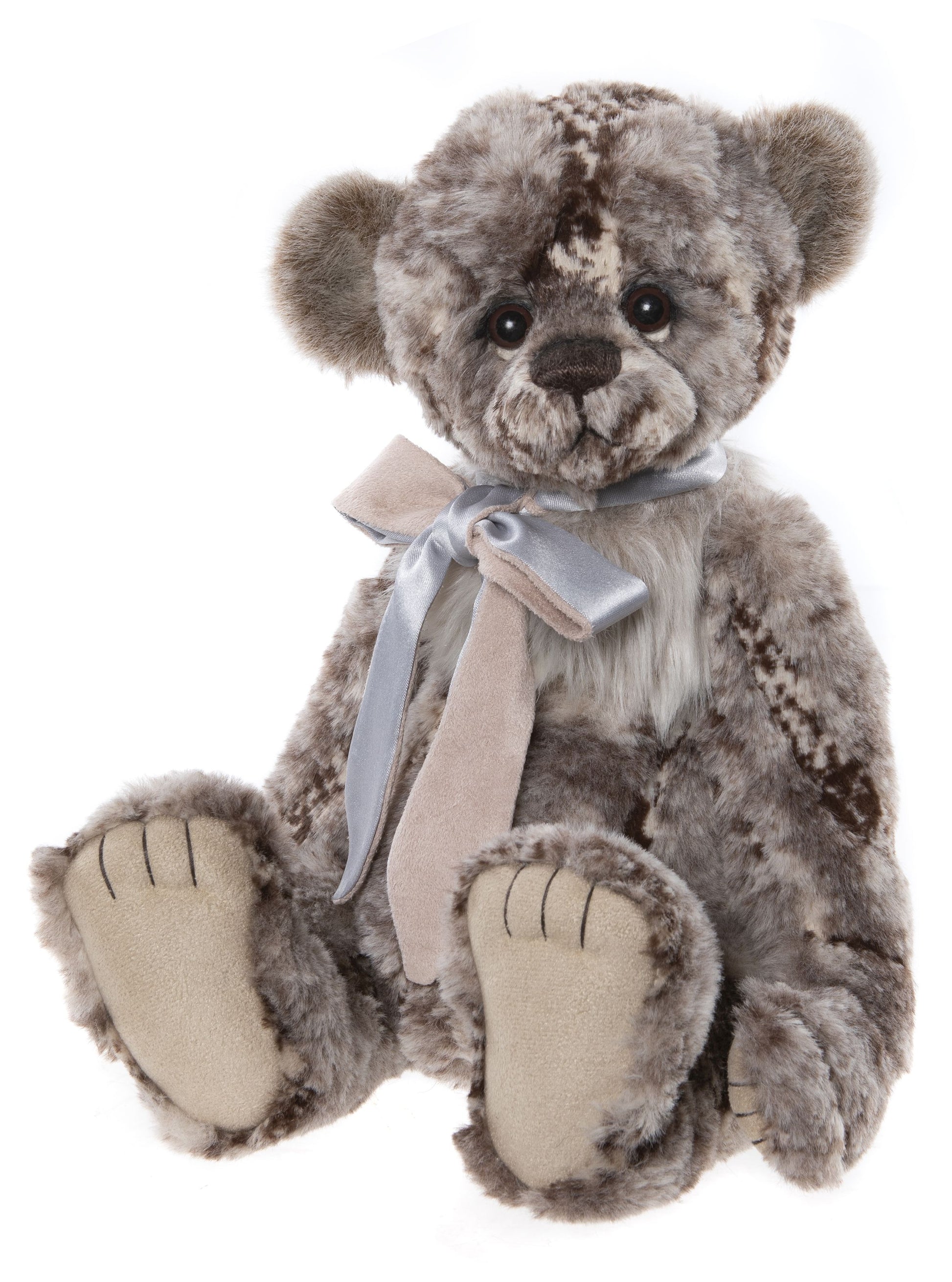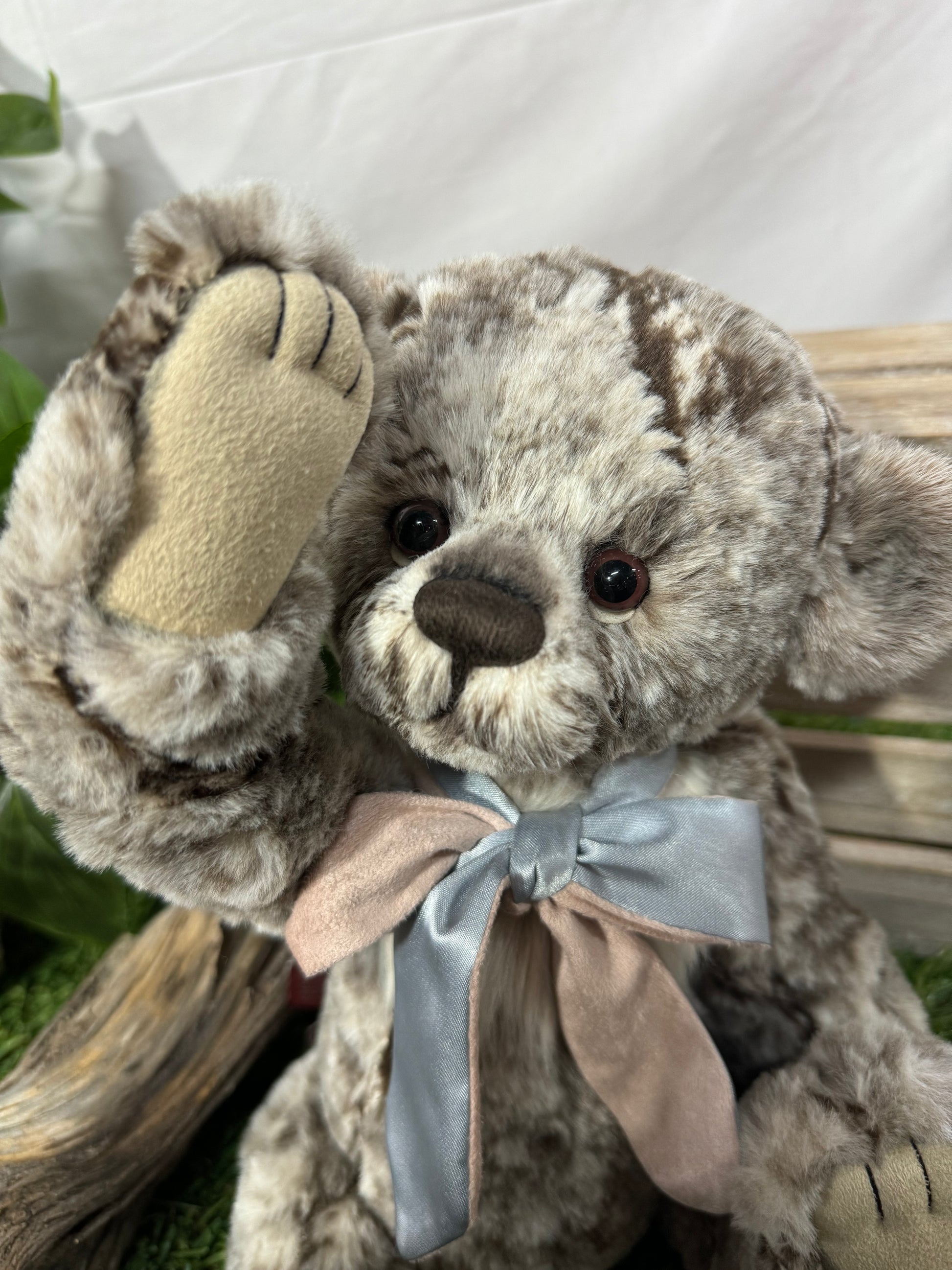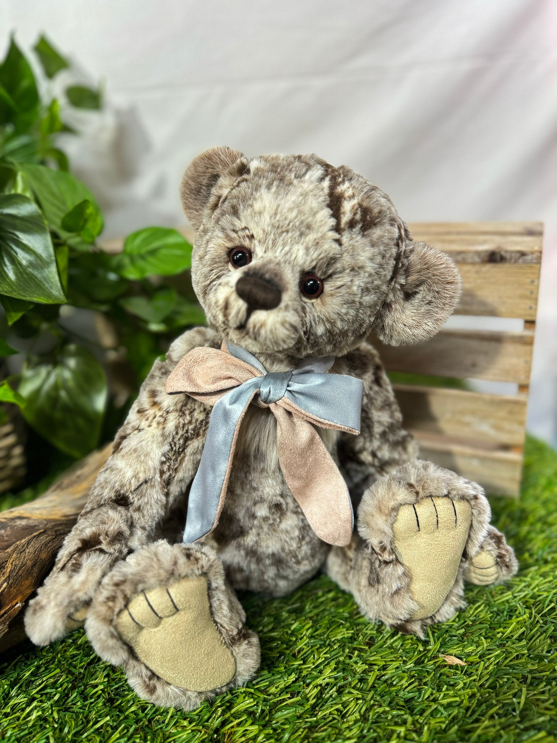 Mo is simply a-paw-able. This cuddly bear displays a super-soft coat of grey and brown plush fur, making him an expert in the field of hugs and cuddles. His innocent eyes, hand-embroidered nose and baby blue and grey bow create a charming finish.