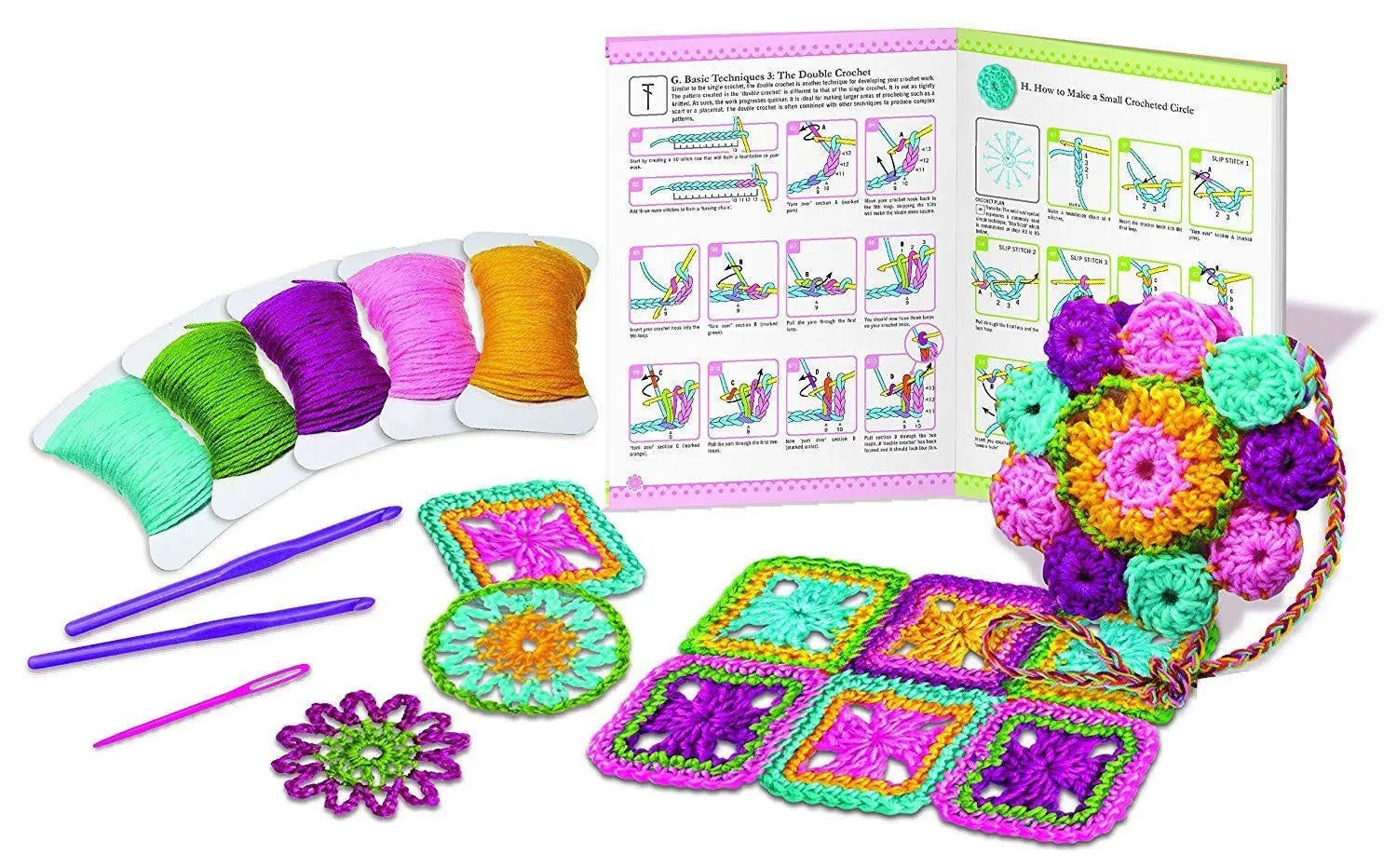 This crocheting kit is ideal for children and beginners. Make a coaster, a fashionable handbag, a place mat or a trendy belt.