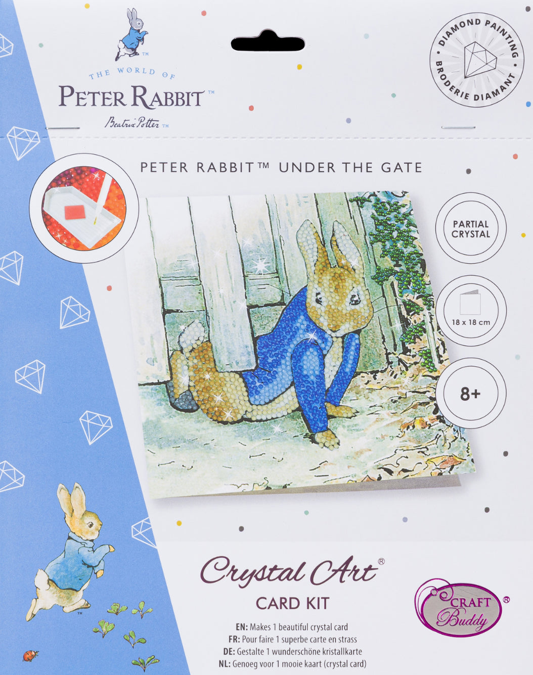 Peter Rabbit Under the Fence 18x18 crystal art card. This Craft Buddy crystal art gem kit is like paint by numbers but with gems.