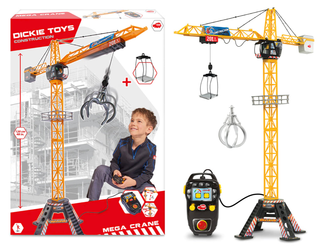 What about being as big as a crane and seeing how it works close up? No problem with the Dickie Toys Construction Mega Crane. The 1.2 metre toy crane with cable remote control is a present that is sure to make children's eyes light up. The crane cabin rotates by 350 degrees at the press of a button, the trolley and winch move just like the full-size version. The various attachments allow all kinds of building materials to be transported. And of course there is a cute character in the open cabin with a new job as a crane driver.