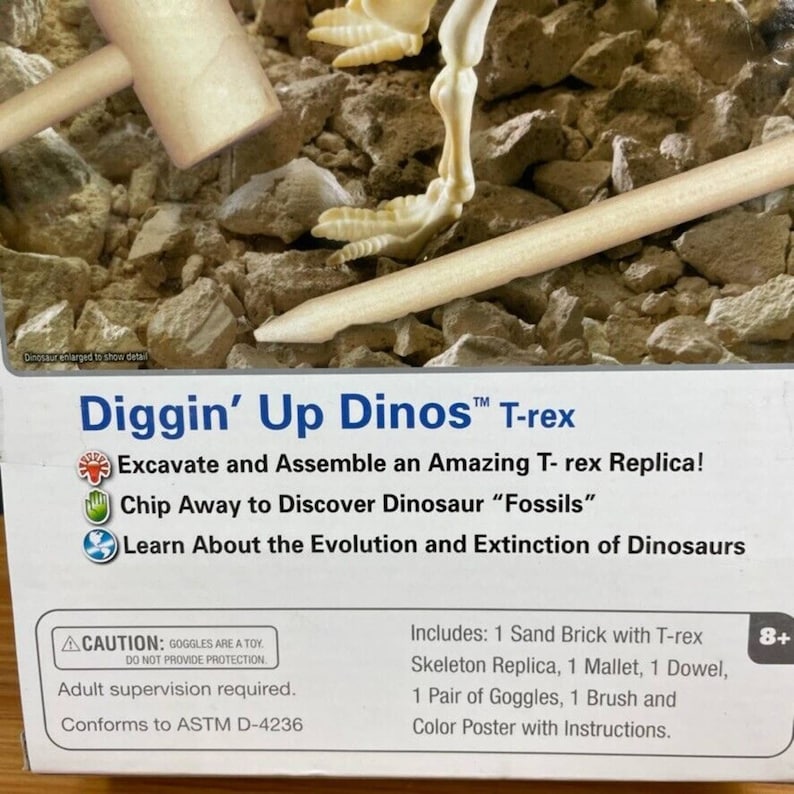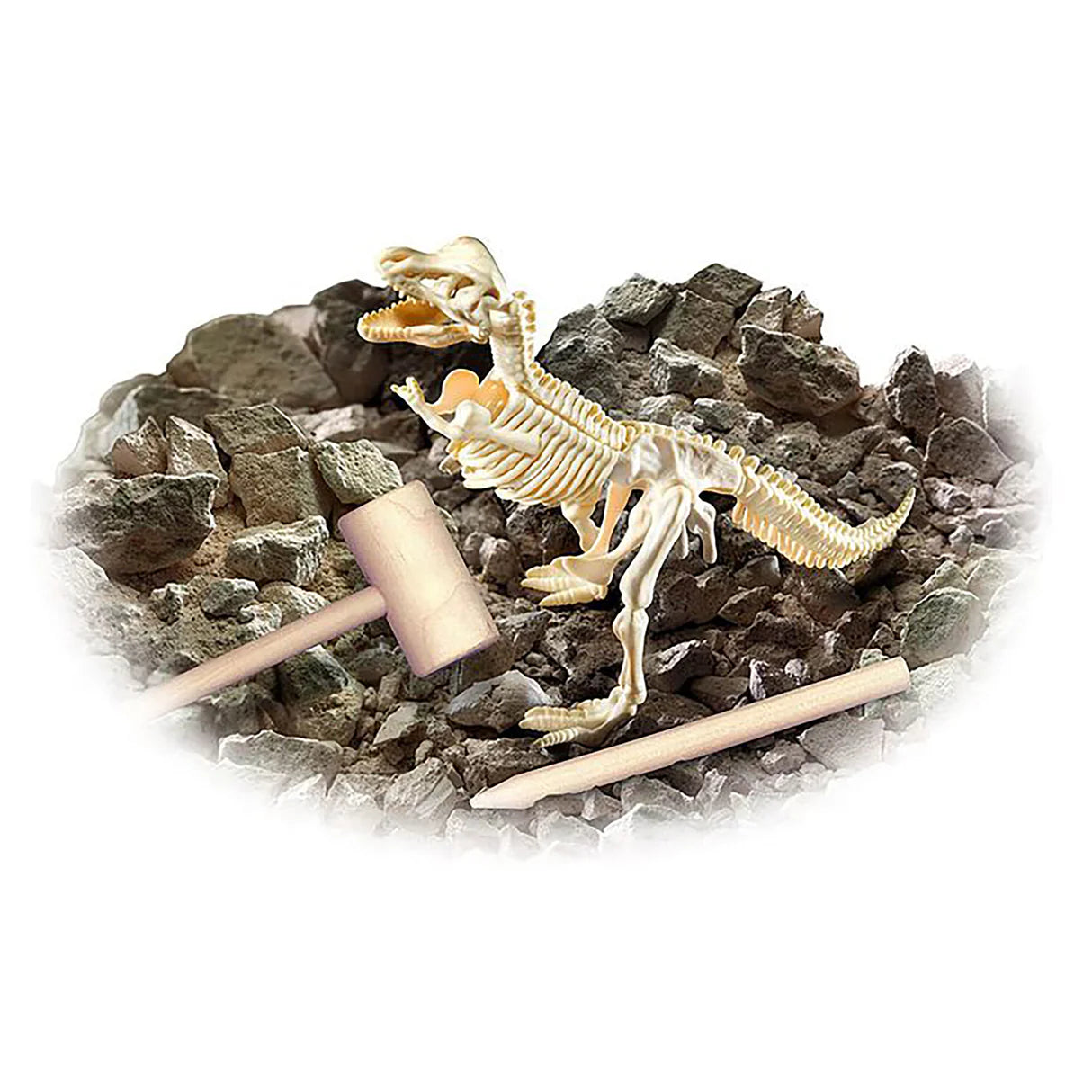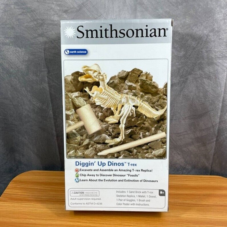 Conduct your own archeological dig with the Smithsonian Diggin Up Dinosaurs kit. A plastic dinosaur T-Rex skeleton is buried deep within a sand block, waiting to be unearthed. Dig it out using excavation tools which are included in the set (hammer, dowel and brush) and assemble the bones into a dinosaur model. Kit includes: safety goggles and a full color instruction poster with content written by a curator at the Smithsonian Institution