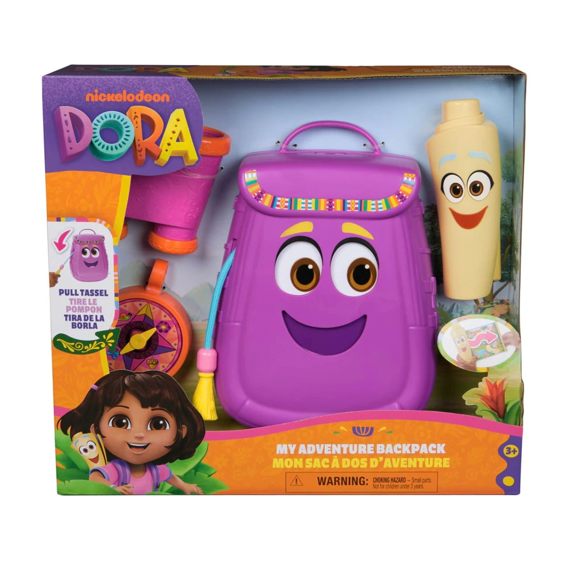 Designed with vibrant colors and featuring Dora’s friendly face, the Adventure Backpack opens up to reveal interactive surprises that spark curiosity and creativity. Inside, kids will find adventure-ready accessories like a play map, binoculars, a compass, and more – just like Dora uses on her journeys!