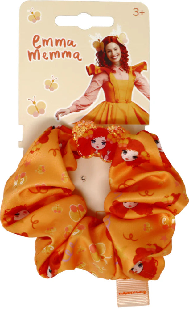 Featuring a Limited Edition Emma Memma print on soft, silky, satin scrunchie and is adorned with a sparkly butterfly that features an Emma Memma character print on top.