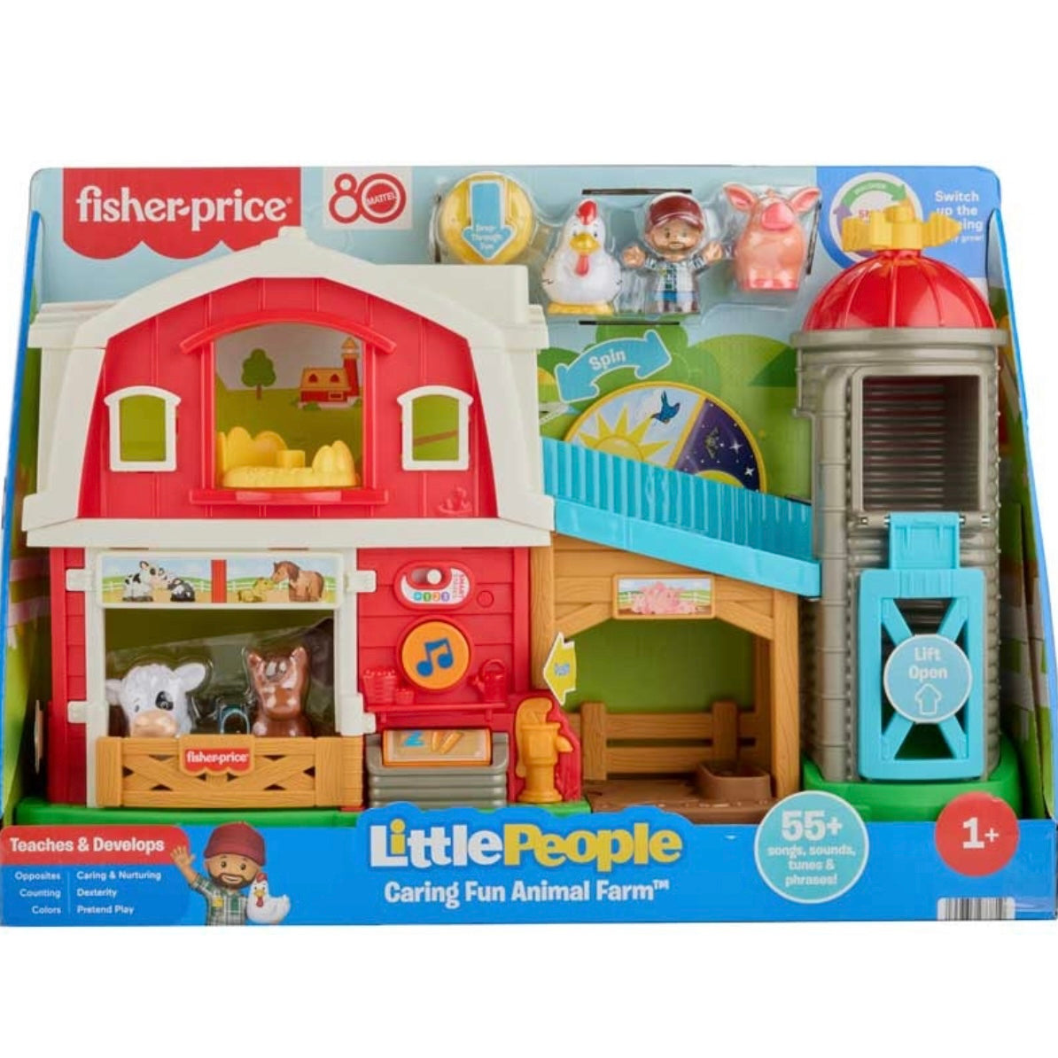 Toddlers can harvest endless hours of imaginative storytelling play with the Little People Caring Fun Animal Farm playset from Fisher-Price. This interactive playset features a two-story barn packed with hands-on activities all around, plus a drop-through silo and multiple stalls to house and care for the animals. As kids play out fun days on the farm, Smart Stages technology introduces opposites, colors, counting and more with 50+ sing-along songs, sounds and phrases. Includes 1 farmer figure, 4 animals, and 1 hay bale play piece. Use the globe button to select a language: English, French, German, Italian, or Dutch. Requires 2 AA batteries (included). Colors and decorations may vary.