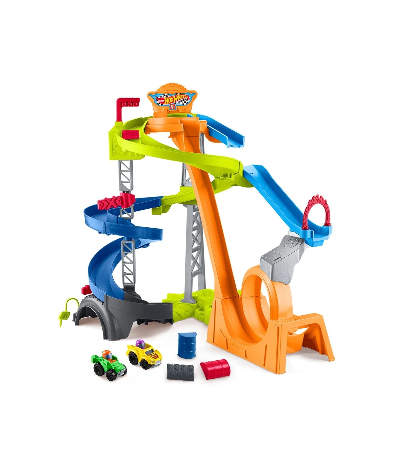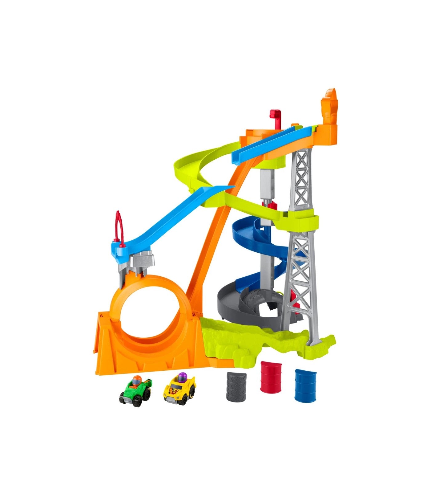 The action-packed Hot Wheels Spiral Stunt Speedway toddler playset by Little People Fisher-Price puts thrilling stunt car excitement into small hands for epic racing play.