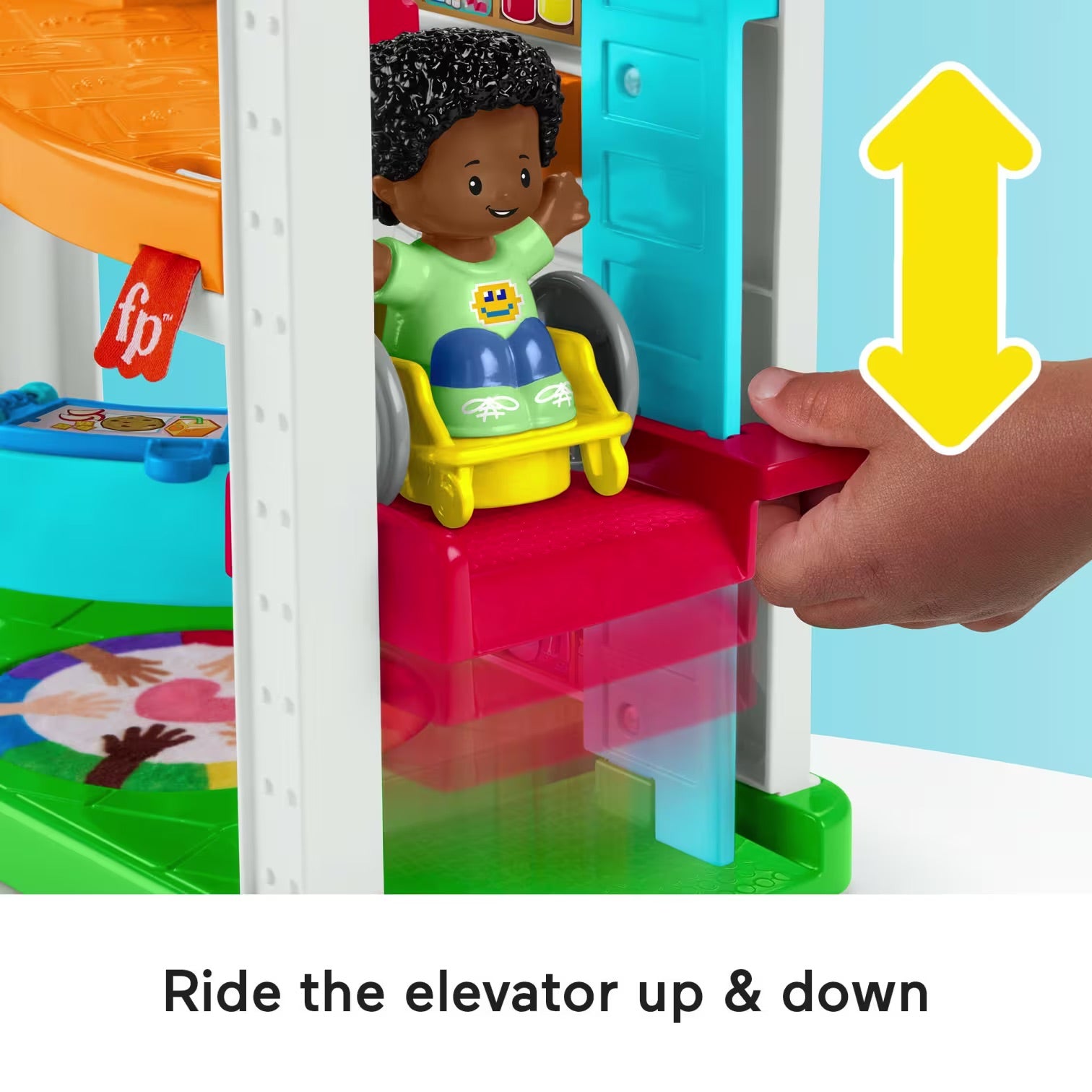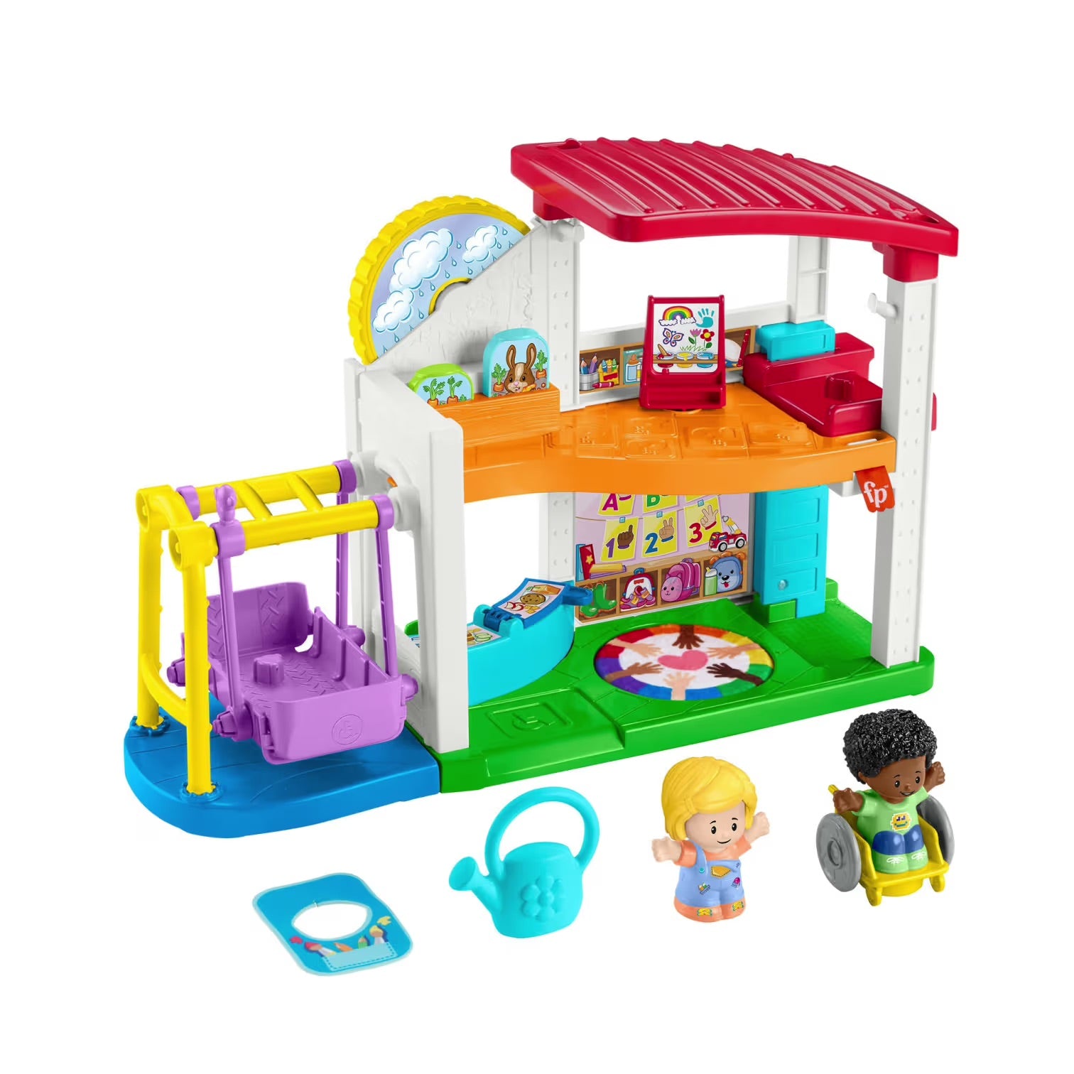 - Hands-on play: rock both figures on the wheelchair-accessible swing, slide the elevator up & down, spin the weather wheel, toggle the garden, and flip the table scene