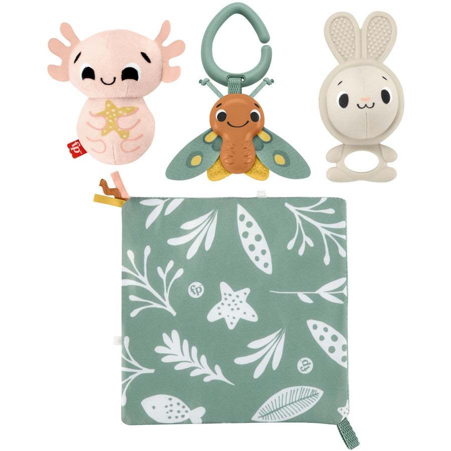 Newborns will love the sensory fun of the So Many Senses Gift Set from Fisher-Price. This set of 4 baby sensory toys includes a BPA-free bunny teether with pop-out jingle ball, a soft axolotl with chime, a textured moth rattle, and a soft fabric crinkle panel with ribbon tag. Designed to be easy for little hands to grasp, these toys help strengthen fine motor skills while fostering a baby’s developing senses of sight, hearing and touch. Moth and crinkle panel easily attach to a baby gym, diaper bag or stroller with a convenient link for travel use. Toy set comes in a giftable package perfect for a baby shower or sprinkle.
