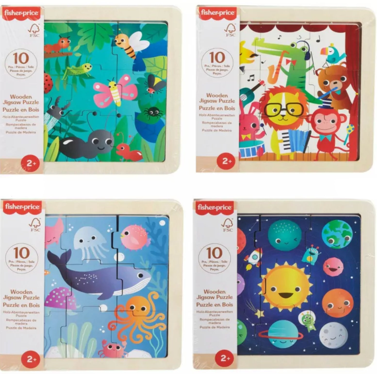 Kids can explore enchanting worlds and spark their imaginations with these wooden jigsaw puzzles from Fisher-Price®. Each 9-piece puzzle features a fun, toddler-friendly theme like the solar system, deep sea animals, musical instruments and jungle safari.
