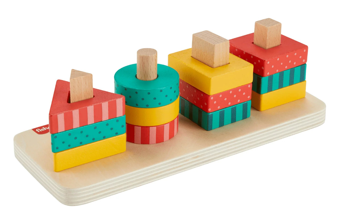 The Wooden Shape Stacker from Fisher-Price® features colorful wooden triangles, circles, rectangles and squares for toddlers to sort and stack on to the base. Made with wood from well-managed FSC®-certified forests, this stacking toy features lots of fine motor activities and is a terrific way to introduce your toddler to colors, shapes, counting and more