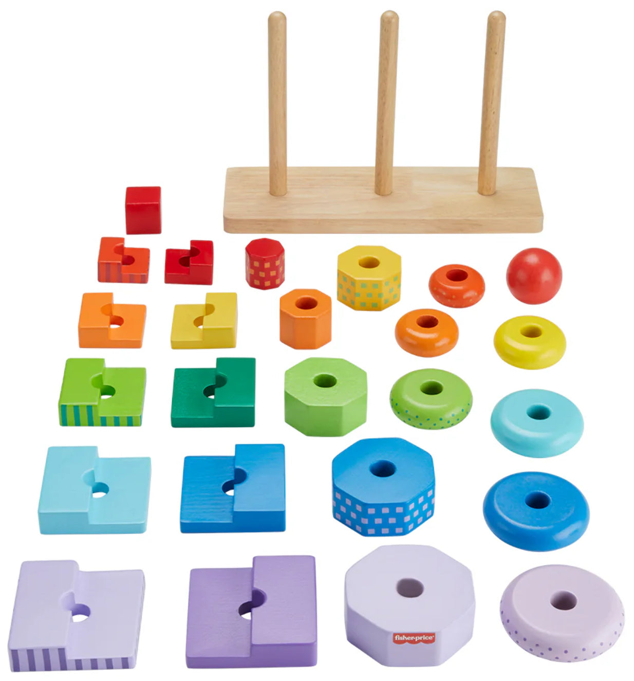 It’s triple the fun with this Wood Stacking Shape Sorter toddler toy from Fisher-Price. This set features easy-to-grasp wooden rings, octagons and 2-part geometric rectangles to sort and stack on the base. Made with wood from well-managed FSC-certified forests, this preschool stacking toy is a fun way to introduce your child to sizes, colours, shapes and more!