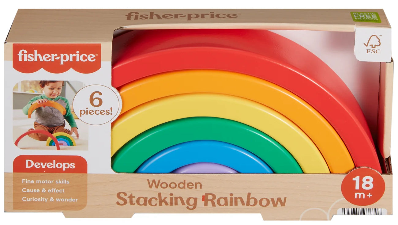 Toddlers are in for lots of skill-building fun with the Wooden Stacking Rainbow toy from Fisher-Price. Six chunky, easy-to-grasp rainbow arches help introduce your child to colours, sizes and how things fit together. Each piece is made with wood from well-managed FSC-certified forests and can help foster fine motor skill development as kids play.