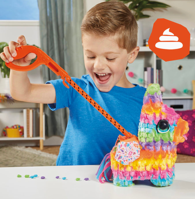 This walking, pooping, plush pinata toy is ready for a party! Give the interactive toy a few of her included play treats, then assemble and attach her leash and take her for a walk. As kids push the pinata along to make her walk, she starts to do her business, leaving a trail of poop nuggets behind! The furReal Poopalots Pinata comes with a saddlebag treat holder to make it easy to keep track of the treats…and the poops! This interactive pet for kids is full of surprises, fun to cuddle, and makes a great kids gift!