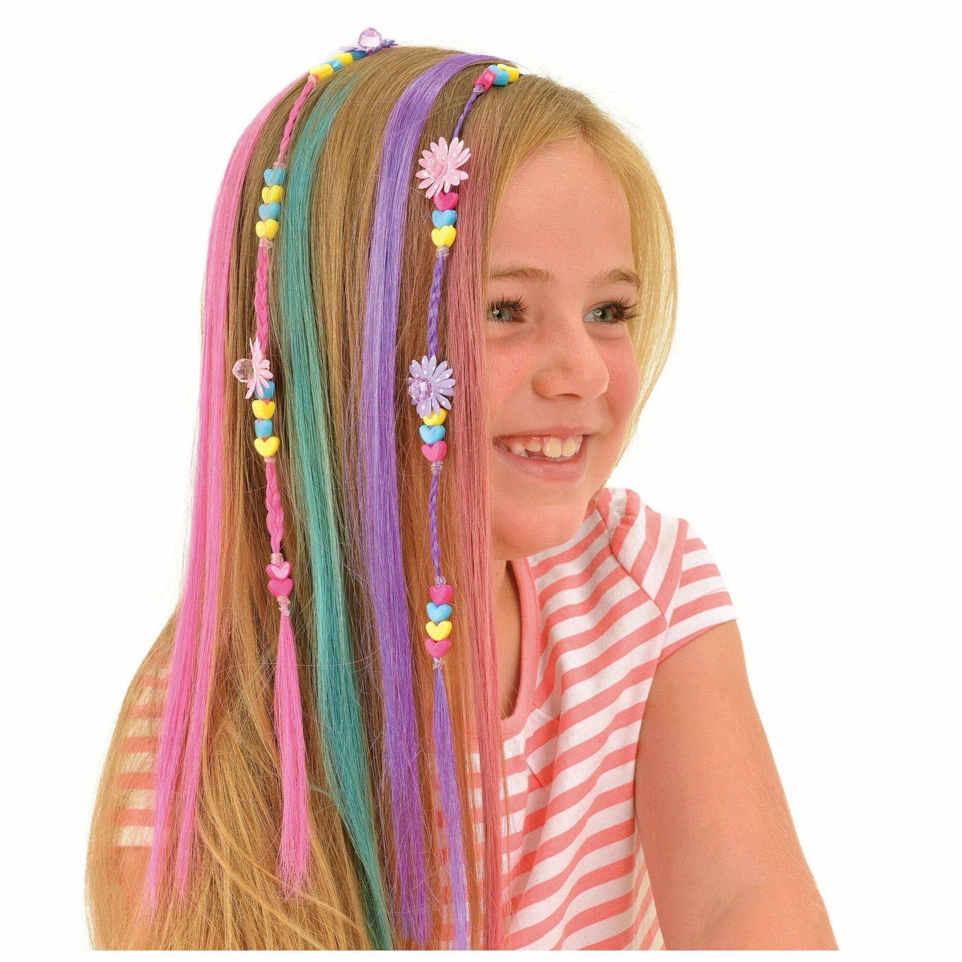 Make and wear fashionable hair extensions and add color with hair chalks! Plait the colored hair extensions and thread on beads and flowers with the beading wand. Simply close the hair chalk compact around the hair, press the center and move down. Contents: 2 hair chalk compacts, 2 colored hair extensions, 30 heart beads, 4 fabric flowers with beads, beading wand, 20 elastic bands and guide. Suitable from ages 6 years plus.