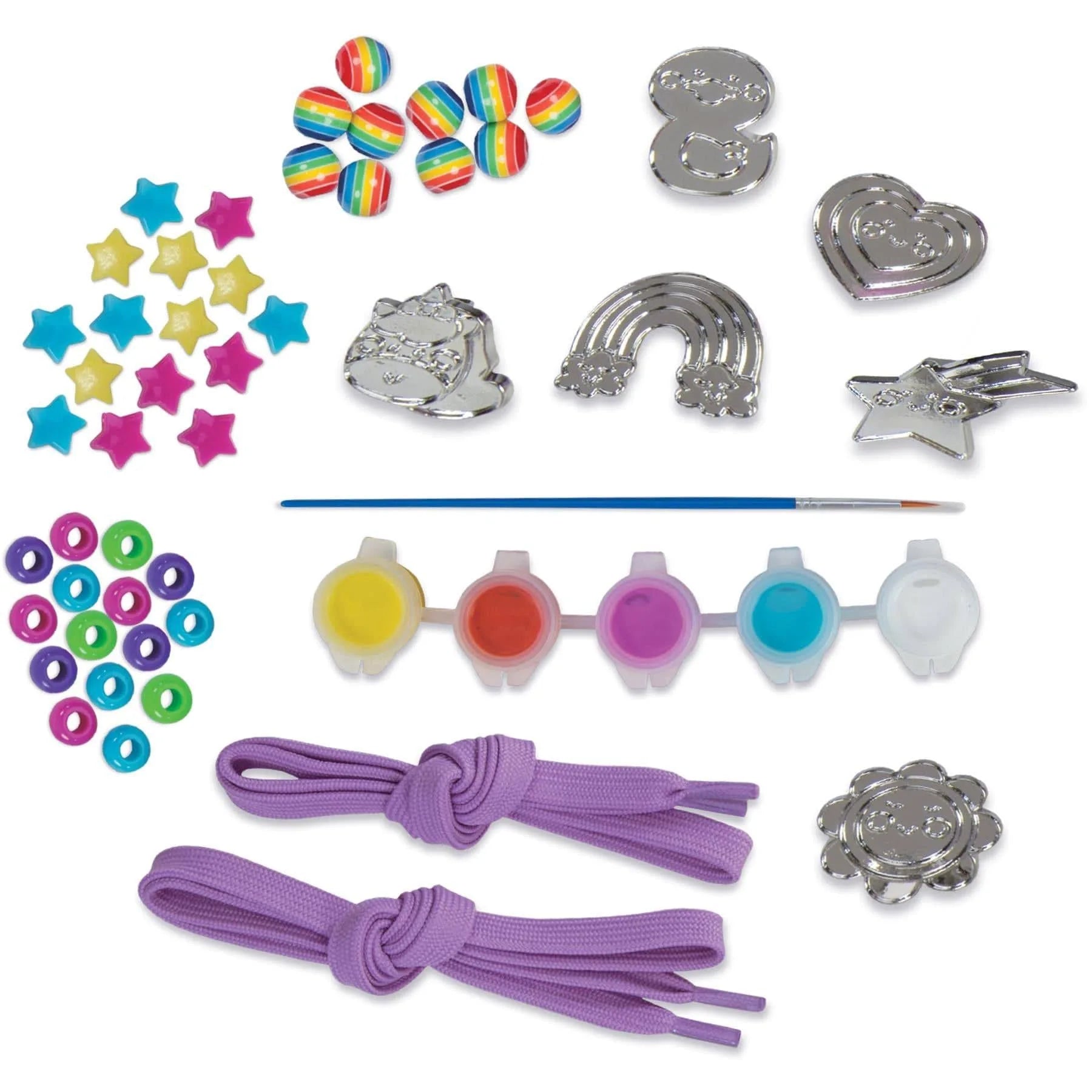 The Galt Lucky Laces is a wonderfully creative activity toy. Customise shoelaces with six charms and three types of beads Transform the blank charms with shimmering enamel paint. Then, following the step-by-step guide, thread these onto colourful laces with the three types of brilliant beads included.