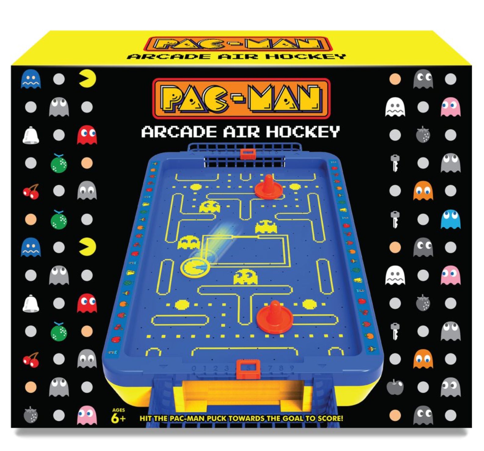 Bring the thrill & excitement of the arcade home with the arcade air hockey game! For years, air hockey has captivated arcade visitors of all ages as the puck glides and rebounds over the table surface at incredible speeds. This set offers all of the fun in a compact set! Just like the full size version, you need to knock the puck into your opponents goal. Turn the machine on to start the air flow, and see the puck start to magically hover around the playing surface. Challenge a friend and start your game! Shoot directly at the goal or bounce it off one of the walls to confuse your opponent and increase the odds to score. Features classic Pac-Man music.