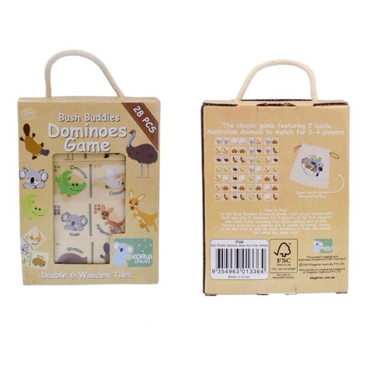 Explore the wild world of Australia with Bush Buddies Wooden Dominoes from Koala Dream, a classic game with a delightful twist. Featuring 7 iconic Aussie animals like the cuddly koala, the bouncy kangaroo, the charming wombat, and more, this set brings the beauty of Australia's wildlife right to your fingertips. Perfect for children aged 3 years and up, these colorful wooden dominoes are not just fun, they are a wonderful way to build memory, matching skills, and early counting abilities while learning about these lovable animals.