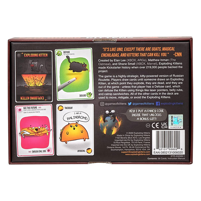 Exploding Kittens is a kitty-powered version of Russian Roulette. Players take turns drawing cards until someone draws an exploding kitten and loses the game. The deck is made up of cards that let you avoid exploding by peeking at cards before you draw, forcing your opponent to draw multiple cards, or shuffling the deck.