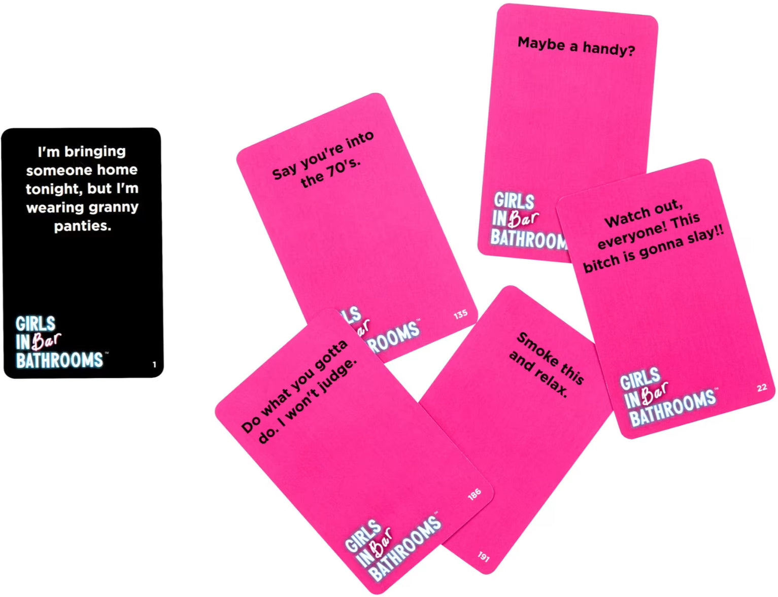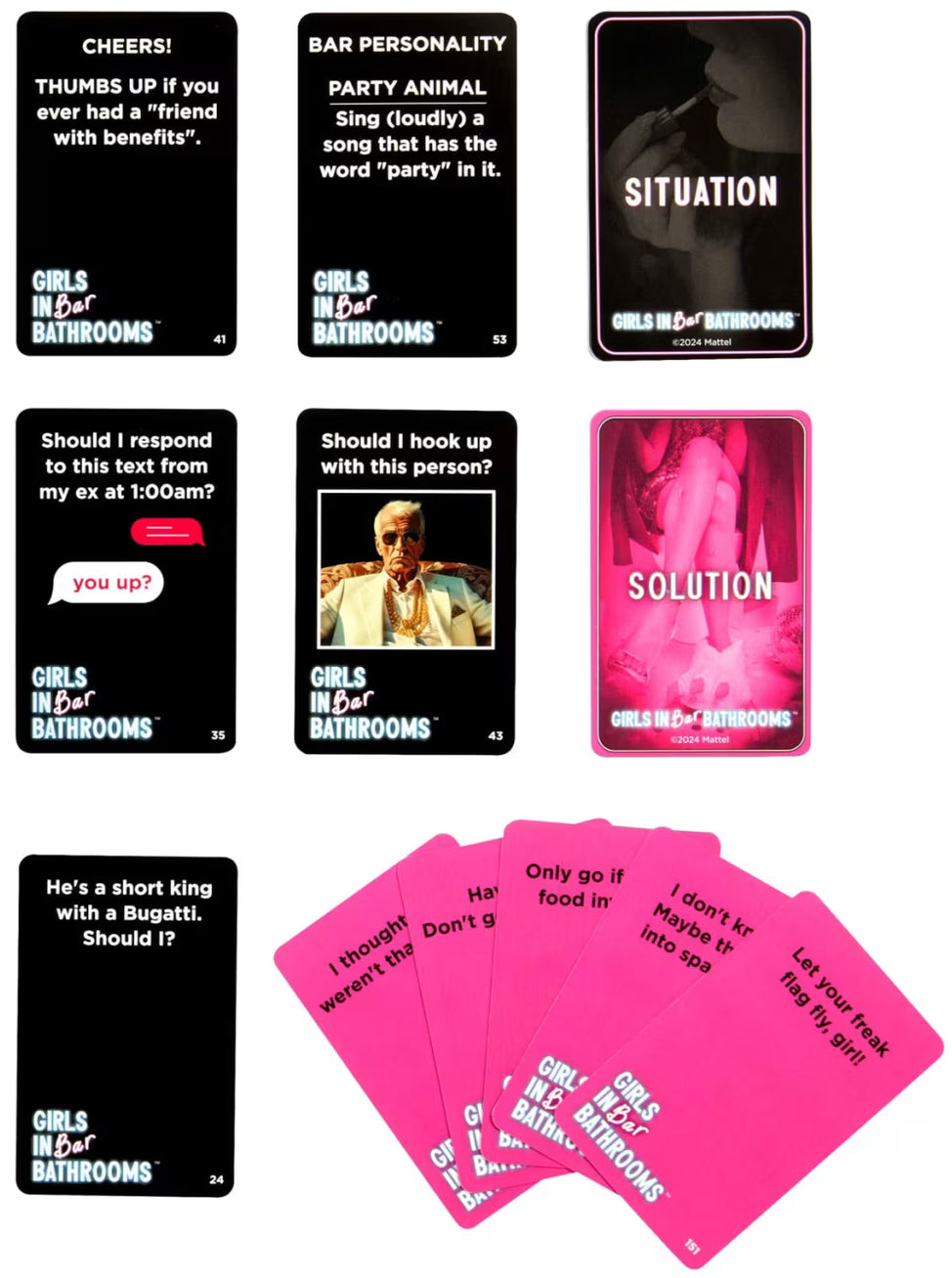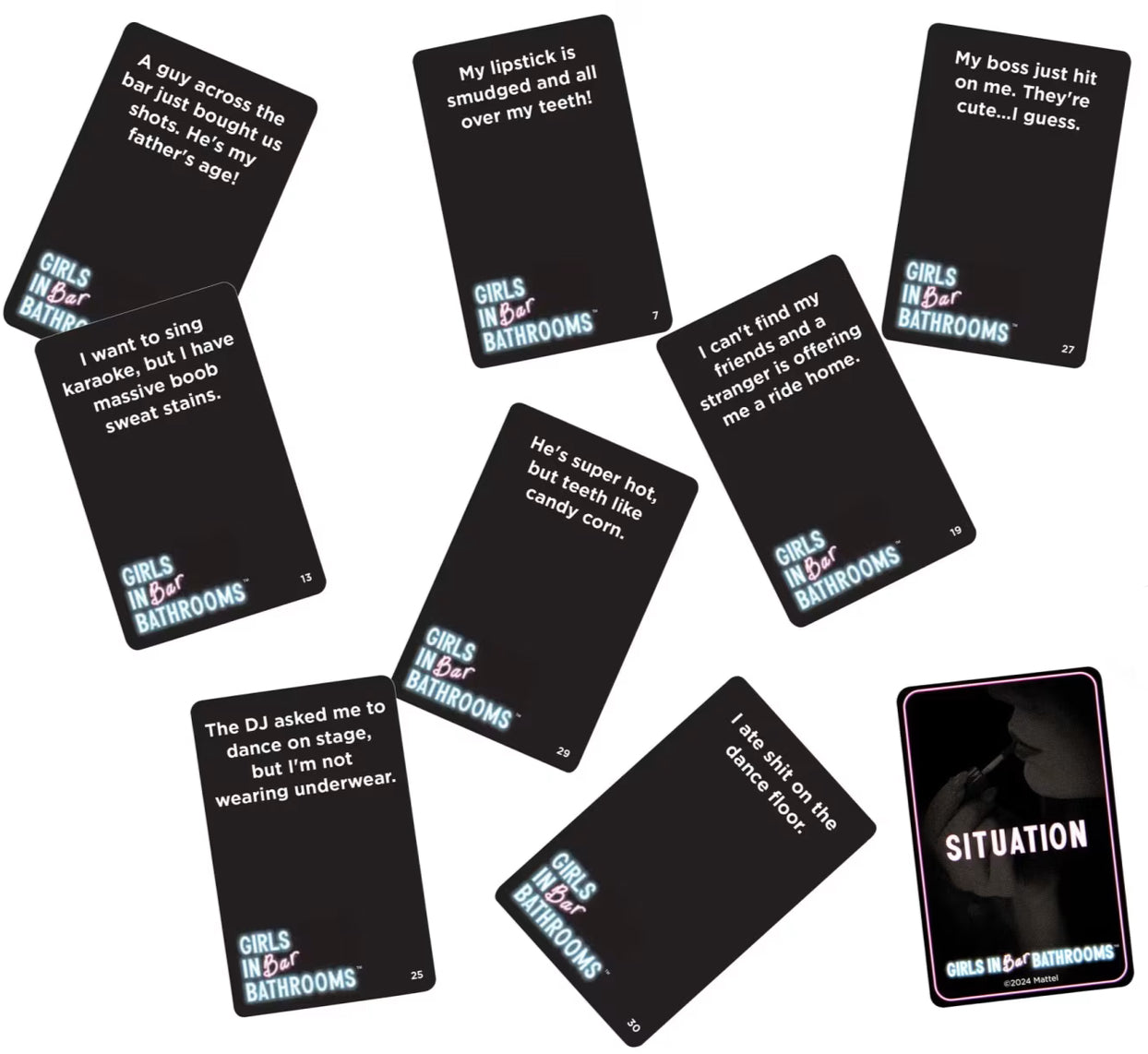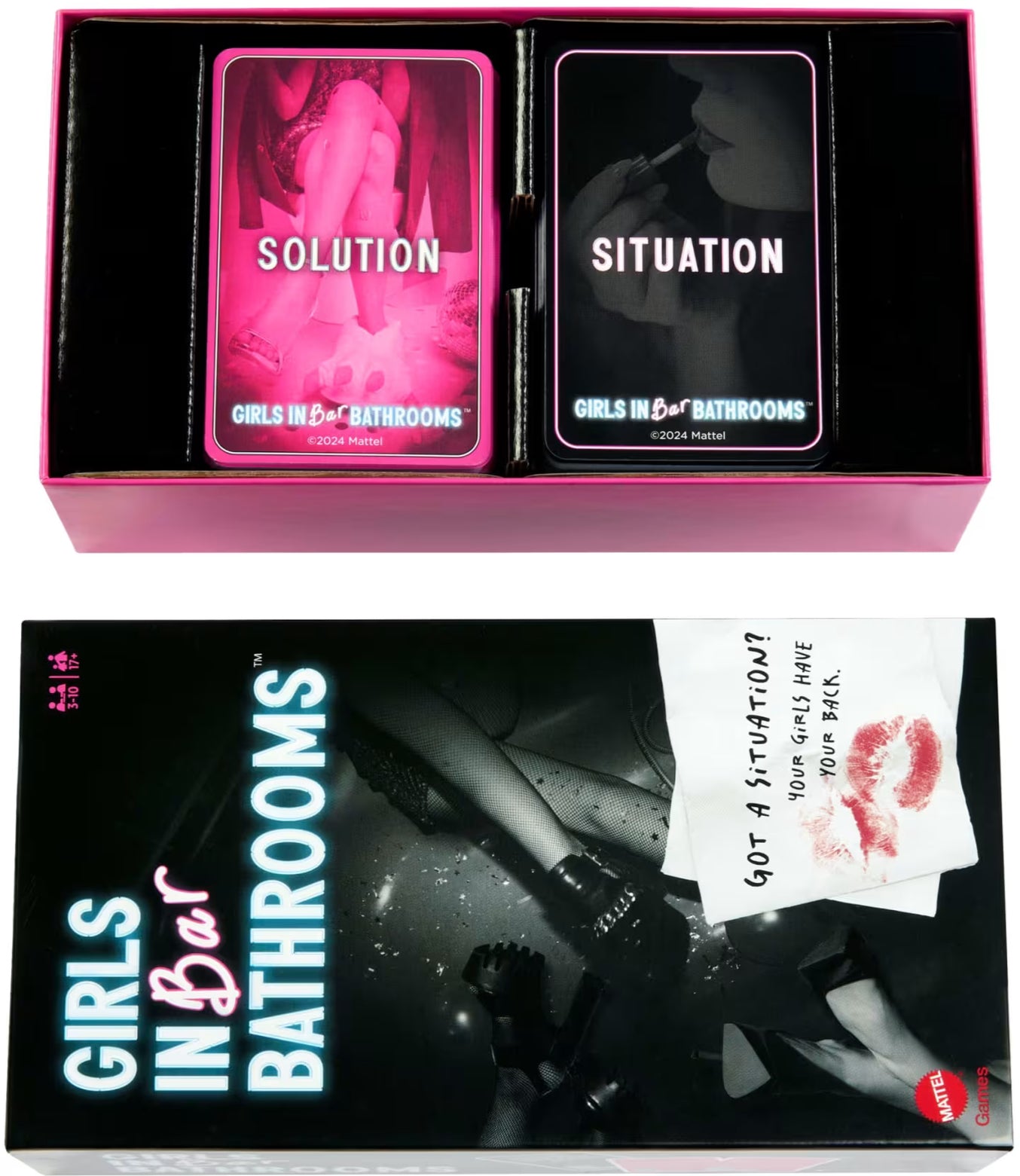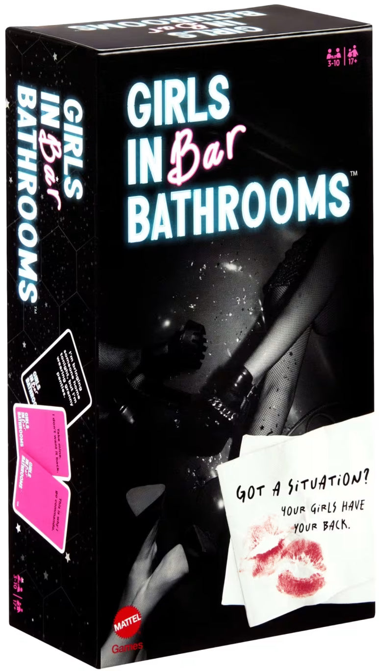 - Just for girls, the Girls in Bar Bathrooms party game is inspired by countless nights spent bonding in the bathroom and features truly relatable situations with hilarious solutions!