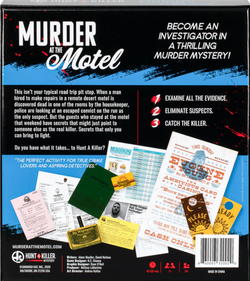 Immerse yourself in the captivating world of Hunt a Killer Mystery: MURDER AT THE MOTEL when a man hired to make repairs in a remote desert motel is discovered dead in one of the rooms by the housekeeper. The rich and suspenseful storyline, filled with unexpected twists and turns, keeps you on the edge of your seat, ensuring an immersive experience that will leave you fully engrossed in the thrilling hunt for the killer.
