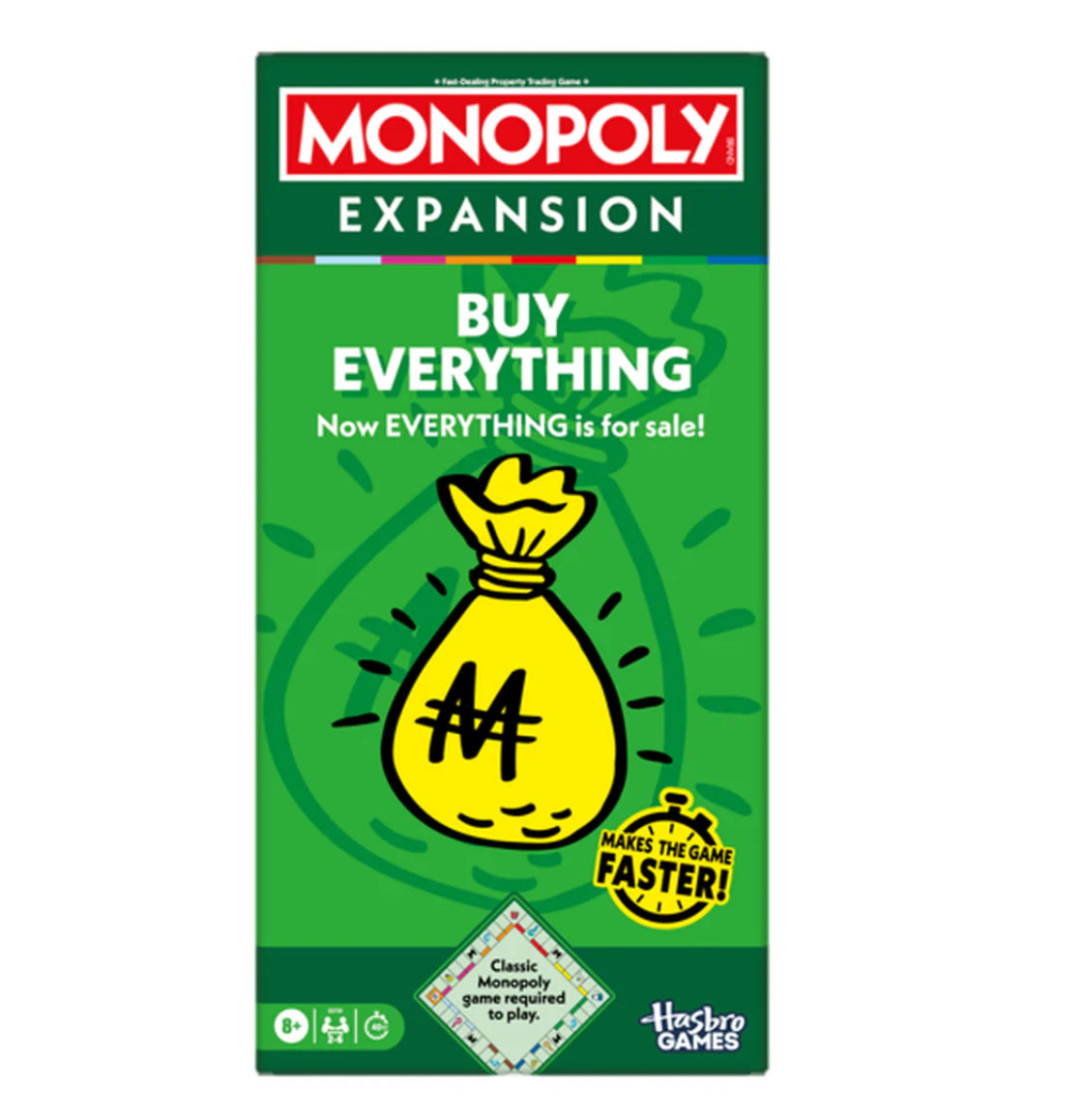 Everything Expansion brings a fresh twist to the Monopoly game and takes half the time to play. Just add this expansion to the classic Monopoly gameboard, and everything is for sale. (Classic Monopoly game required to play. Sold separately.)