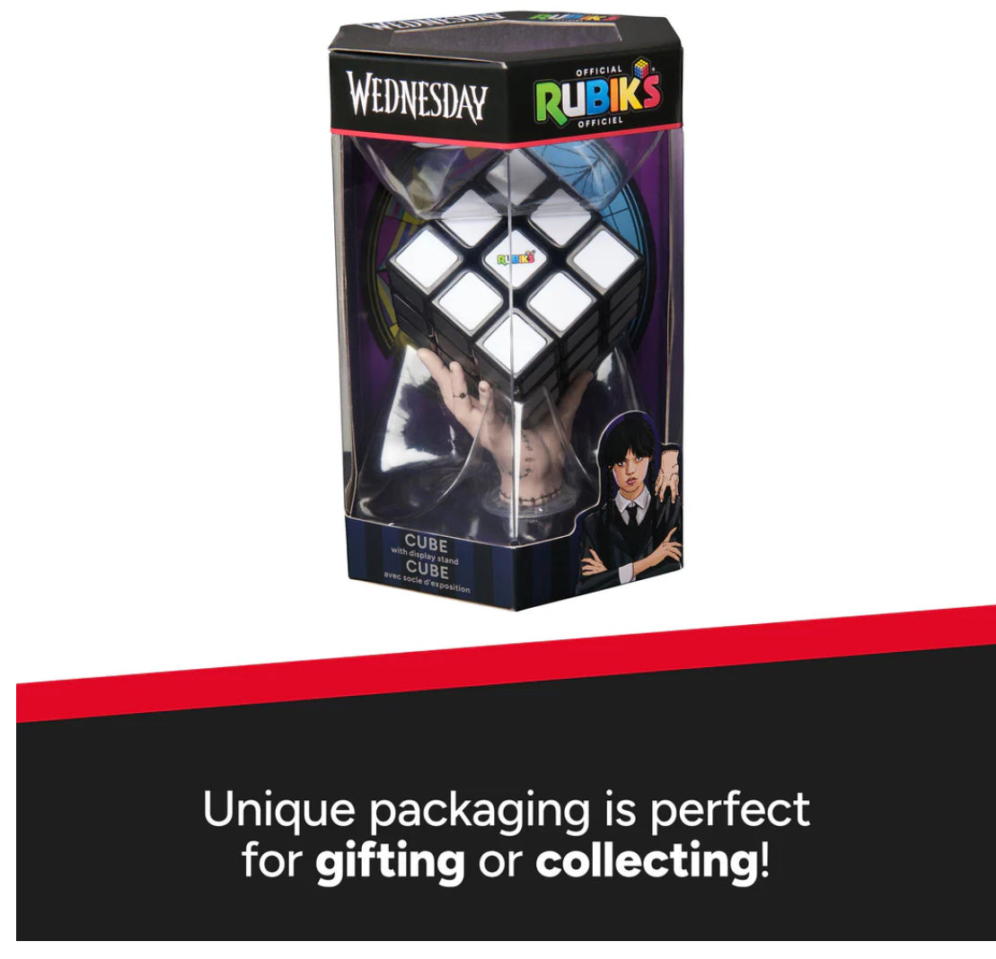 WEDNESDAY CUBE: Twist, turn, and show off your moves with your own greyscale Wednesday Cube, as seen on the hit series, Wednesday. Made with 6 shades of grey, it’s the ultimate Cube for anyone “allergic to colour.”