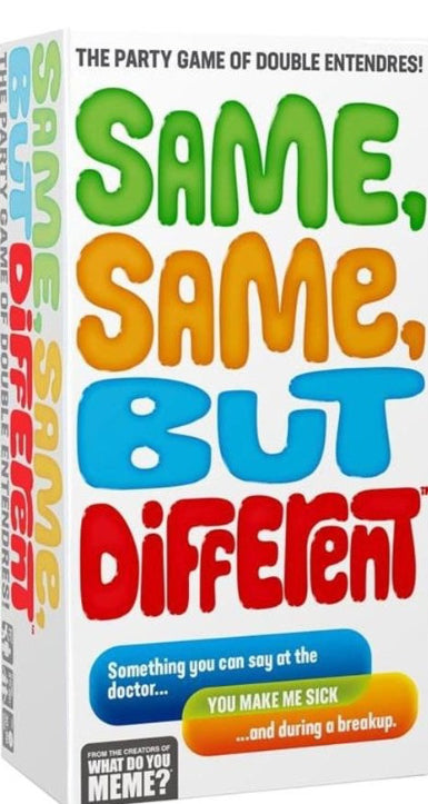 Looking to put your pun-tastic wordsmithing skills (or immature mind) to the test? Sounds like it's time for Same Same but Different, the party game of ridiculously funny double entendres! Setup is simple: Players draw a ''Safe" Card and a "Risky" Card, and compete to find the funniest phrase that suits both situations. This card game is perfect for those who are great at making jokes about the spicy parts of life... even when they probably shouldn't. Bring Same Same but Different to your next housewarming gathering, bachelorette party, friend group hang out, or any other fun event you have planned! Brought to you by What Do You Meme? Ages: 17 + | Players: 3 + | Playtime: 30-90 min