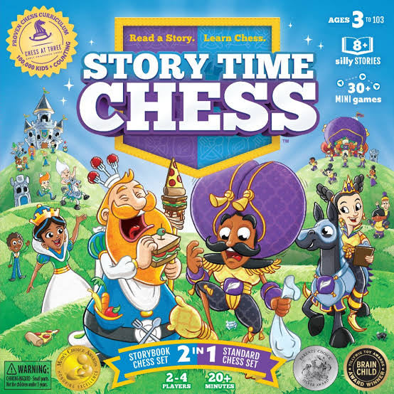 Story Time Chess is a board game that teaches chess to young children using silly stories, vibrant illustrations, custom chess pieces, and a unique chess board. The stories and supporting materials communicate the rules of chess to children ages 3 and up in a way that makes learning chess simple and fun.