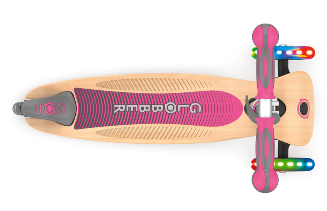 Globbers first-ever wide 7-ply wooden scooter is packed with all of PRIMO FOLDABLE’s patents and features but it’s designed with a 100% sustainable wooden deck with antislip grip tape and laser engraved sides and comes with light-up LED front wheels.
