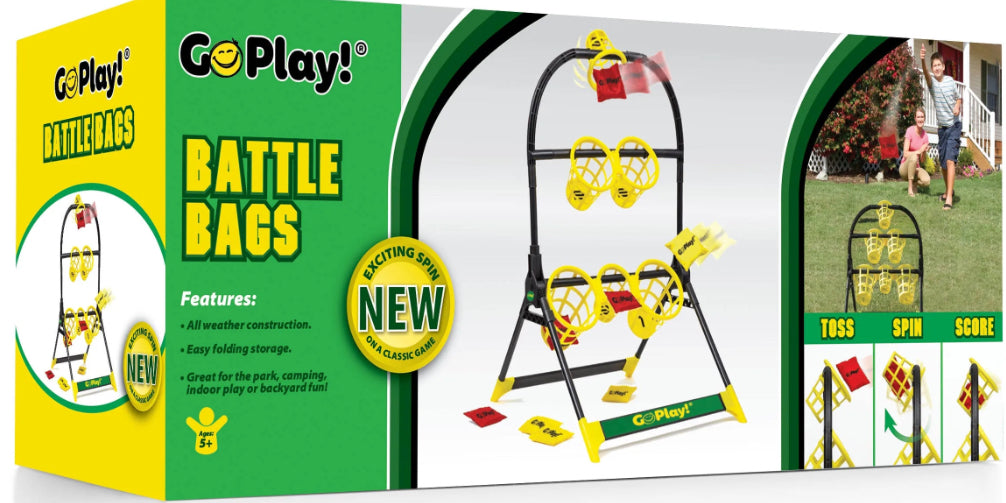 Go Play! Battle Bags is a fresh take on a tailgating classic, similar to cornhole or bean bag toss, but with a new target design that is vertically placed with free spinning baskets for a new challenge.