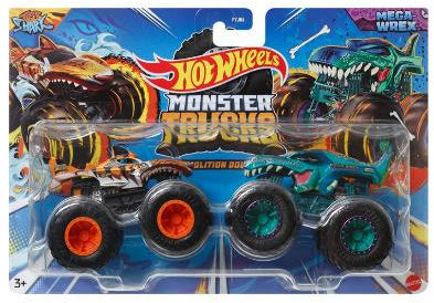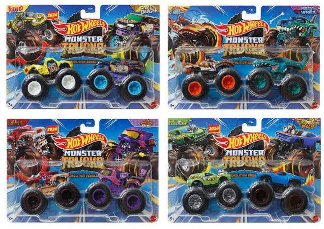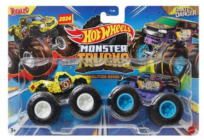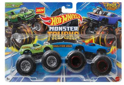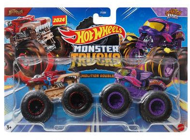 The Hot Wheels® Monster Trucks 1:64 Scale Demolition Doubles™ trucks stand by to smash their arch-rivals! These two-packs of Monster Trucks squaring-off for epic crash attacks are purposely paired for head-to-head battles with their GIANT wheels and big personalities! Every package includes two opponents and the package provides stats for each including name, truck type, strength, unique crash attack and motor-vation for great storytelling fun! Each sold separately, subject to availability. Colors and decorations may vary.