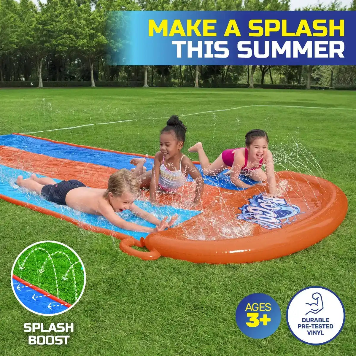 Bestway® Summer fun is here with this Triple lane water slide! Built-in water jets keep the lane slick and smooth for that ultimate sliding experience. A fantastic activity that will be a definite favourite this summer. Product Features: Triple Lane Inflatable Water Slide Qty: 1 Length: 4.8m Materials: Durable Nylon Lined With Built-In Water Jets Ground Stakes Included Smooth Edges For Added Safety UV Resistant Jets Keeps Lane Slippery Easy Set Up Connects To A Standard Hose Portable Great For Open Spaces In The Yard Fantastic Summer Fun