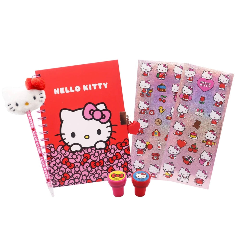 Hello Kitty lockable dairy set includes a Pom Pom pen, 2 stamps, holographic sticker sheets and A5 serial secret diary with a lock.