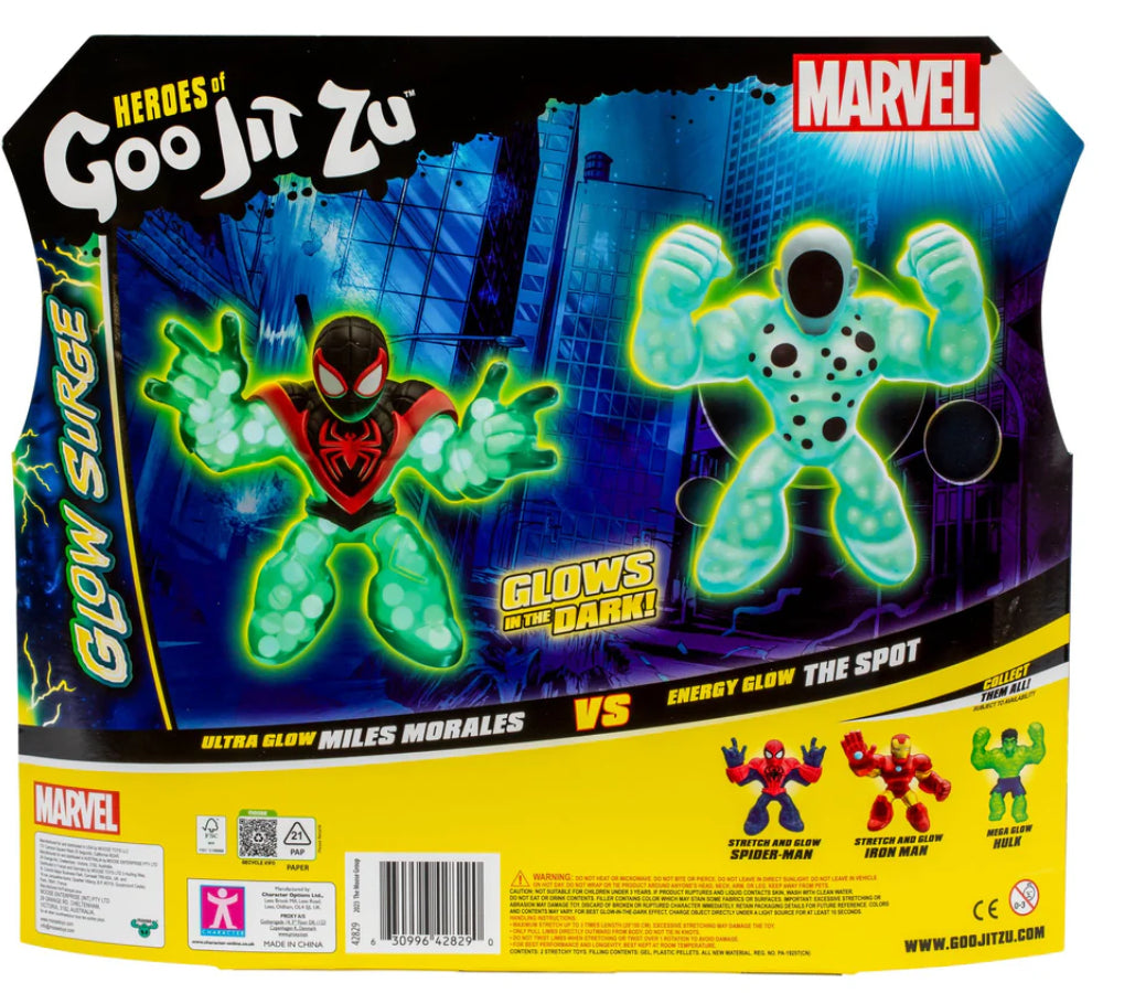 Marvel Superheroes and the Heroes of Goo Jit Zu have combined forces again to bring you the ultimate glowing, stretchiest Superheroes ever! Introducing Heroes of Goo Jit Zu GLOW SURGE! Who will be victorious in the Spider-Verse Super Collider Pack as Ultra Glow Miles Morales versus Energy Glow The Spot in this awesome Glow Surge Marvel Versus 2 Pack?