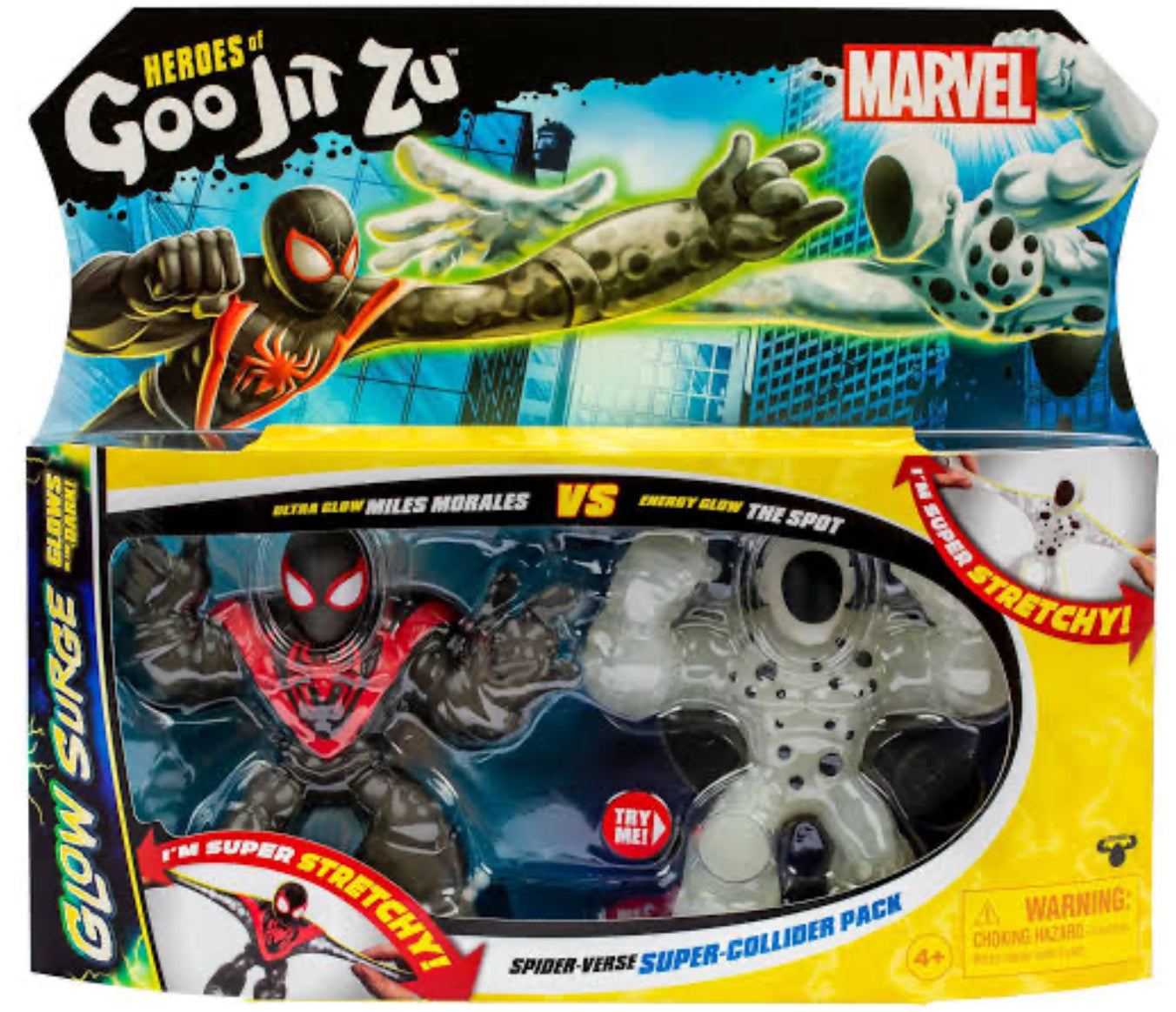 Battle straight out of the box! The Spider-Verse Super Collider Pack contains one super stretchy exclusive 4.5" Miles Morales Goo Jit Zu figure with Ultra Glow filling and one 4.5" super stretchy The Spot action figure with awesome Energy Glow filling.