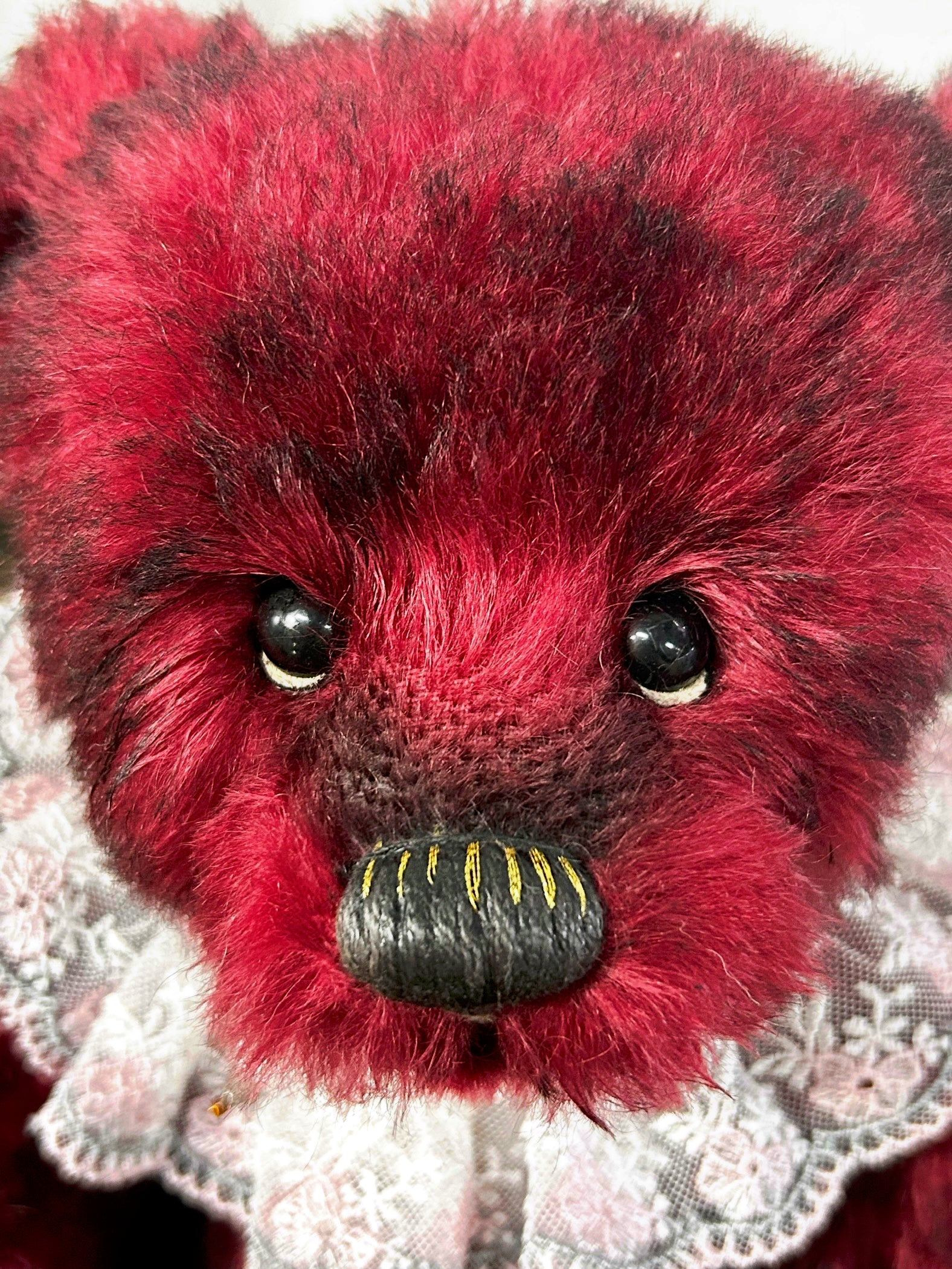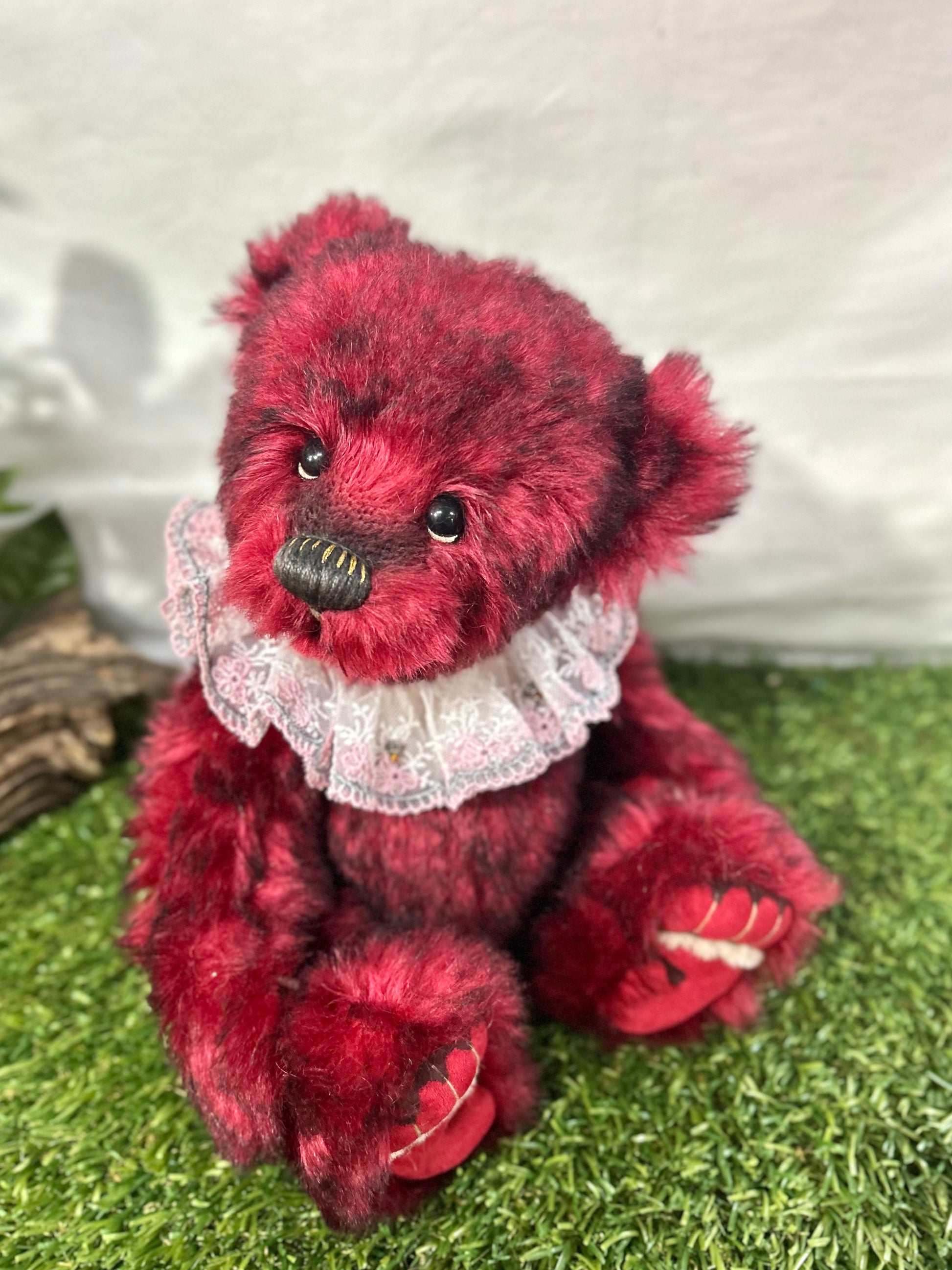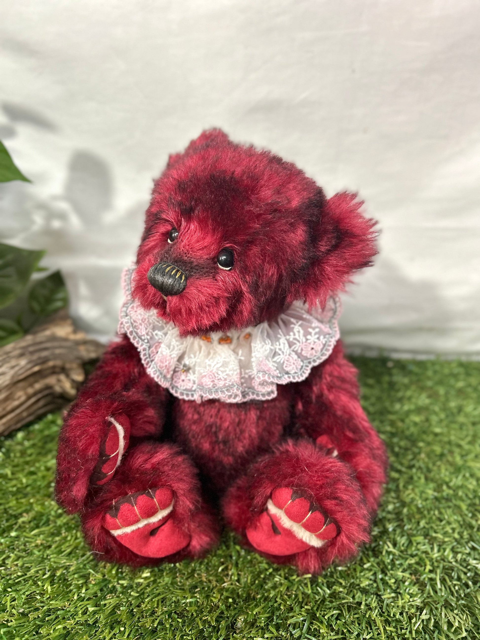 well-known puzzle games. Anna Gram is paw-geous deep red coloured bear from our 2024 Isabelle Collection, made from sumptuously dense alpaca and mohair fur. She features captivating dark eyes and her sculpted paw pads feature delightful tickly toes, complemented by a touch of grey fur underneath. She is elegantly finished with a beautiful lace collar. Numbered limited-edition of only 200.