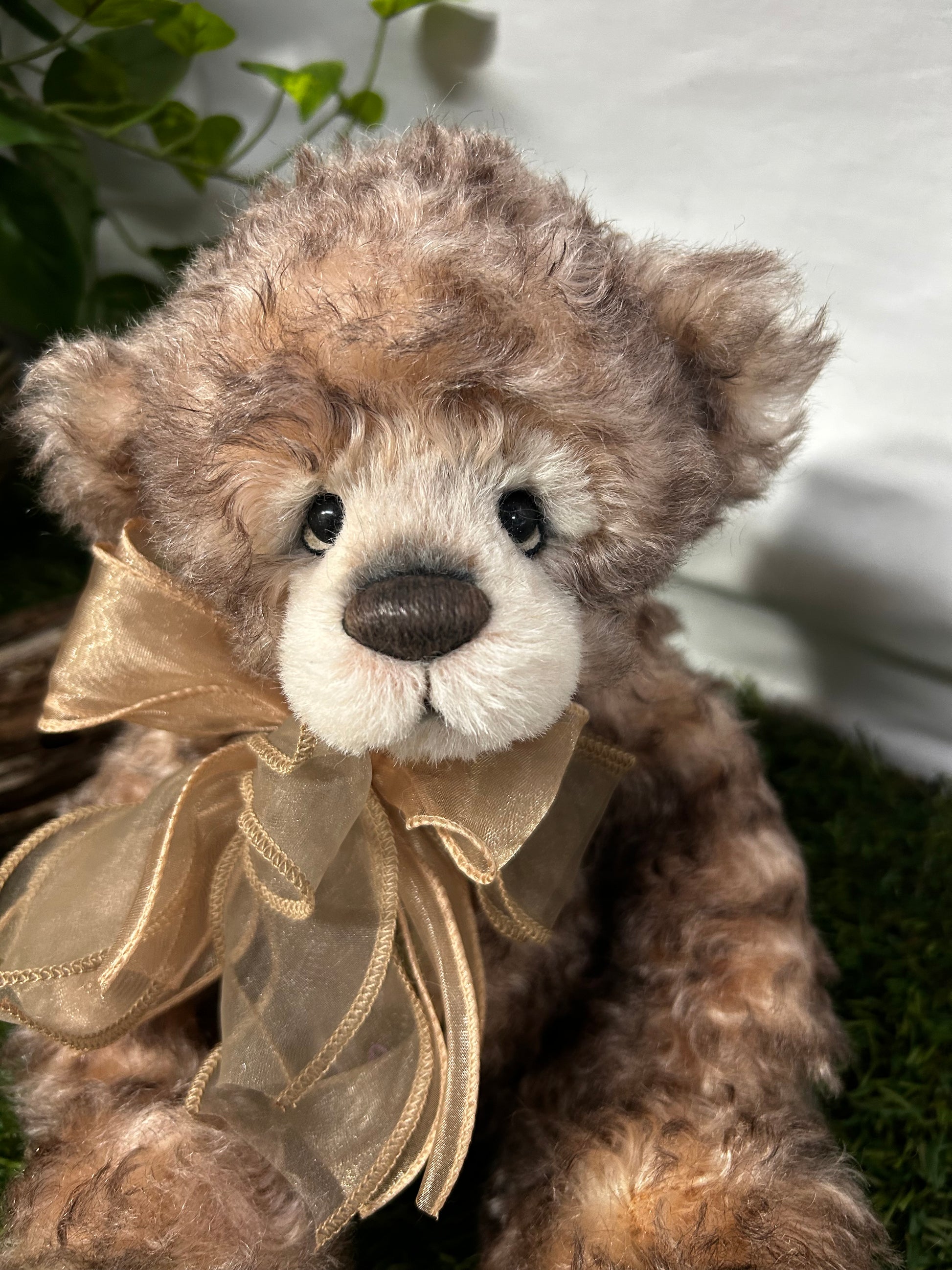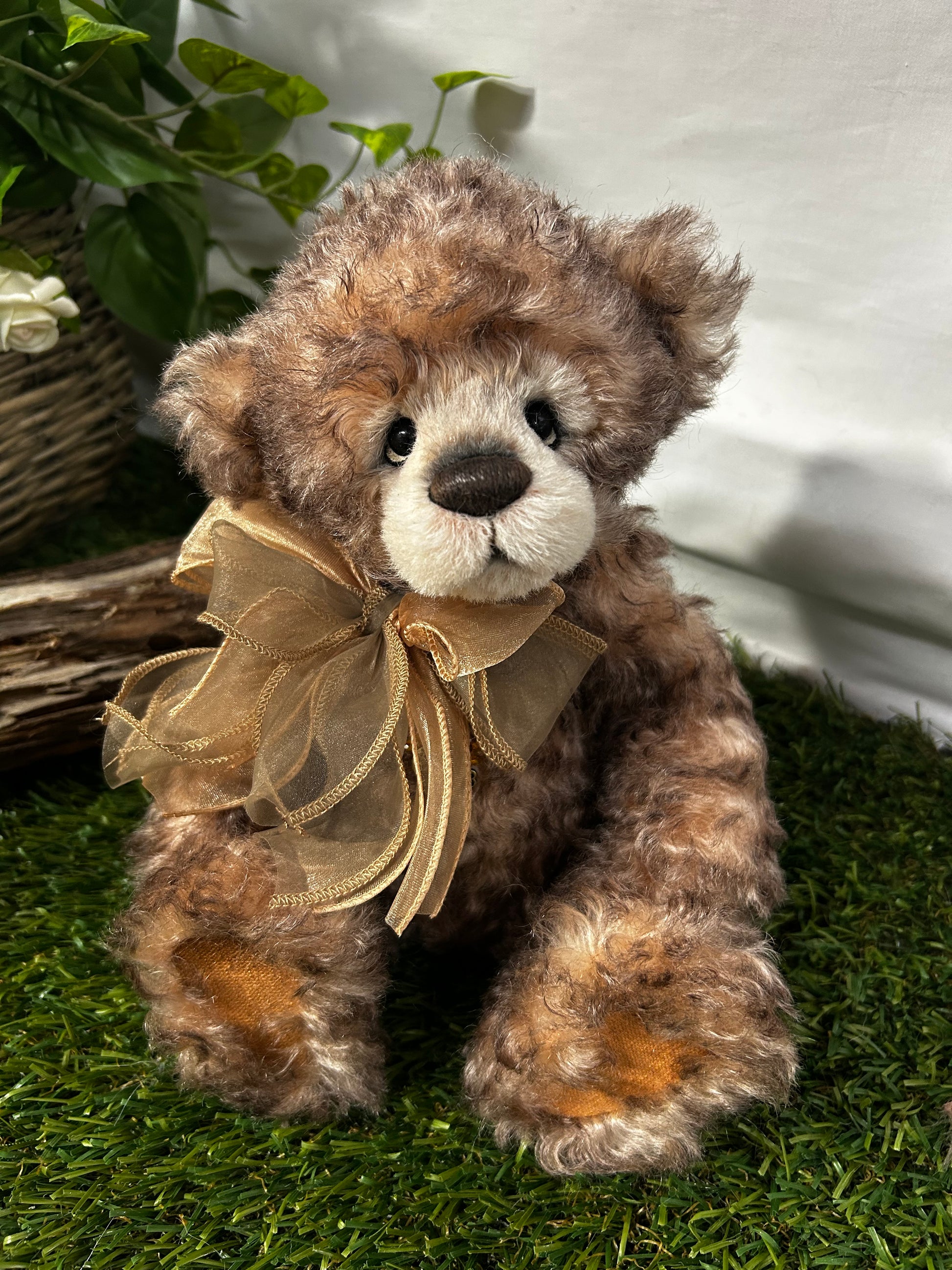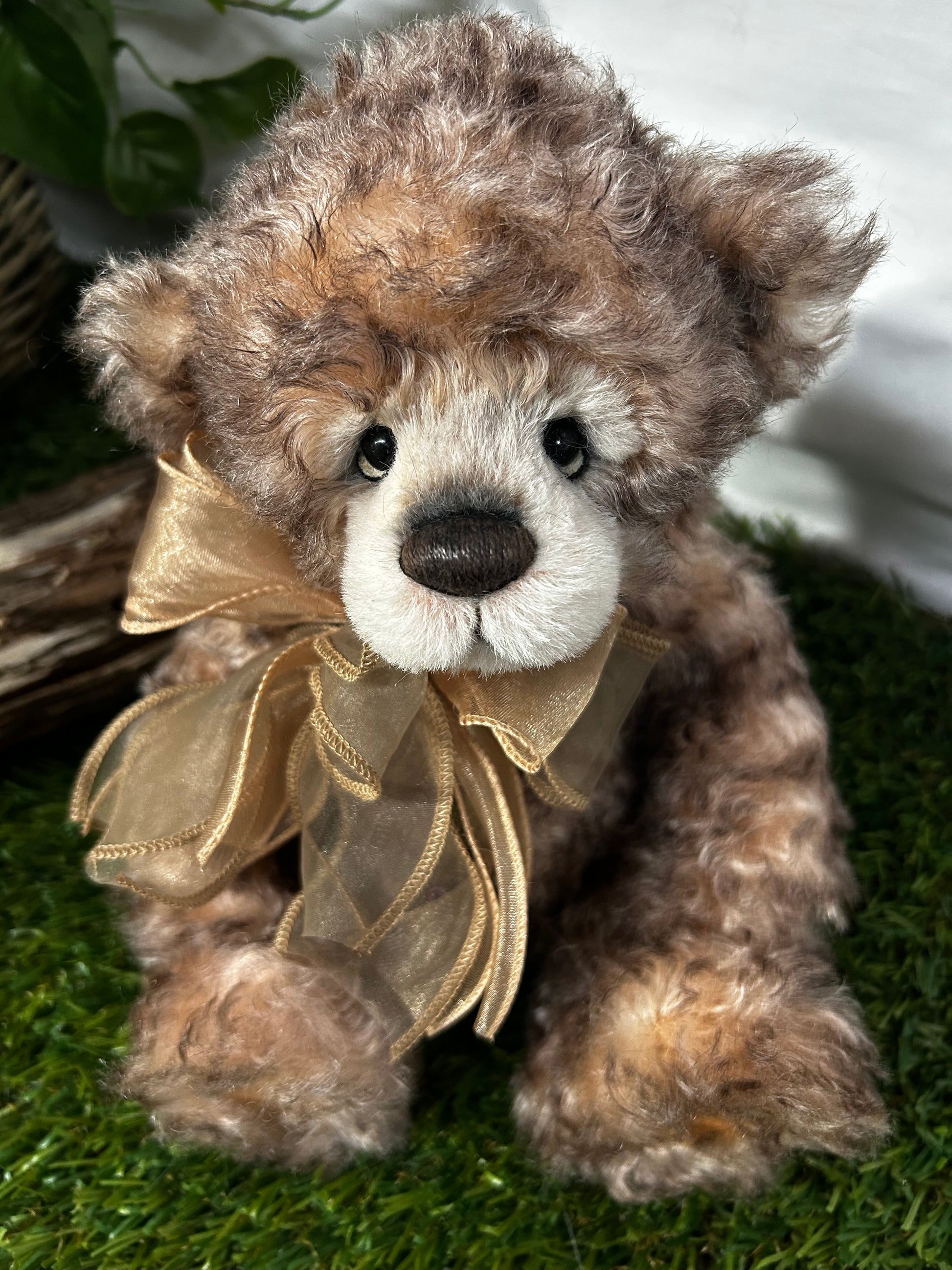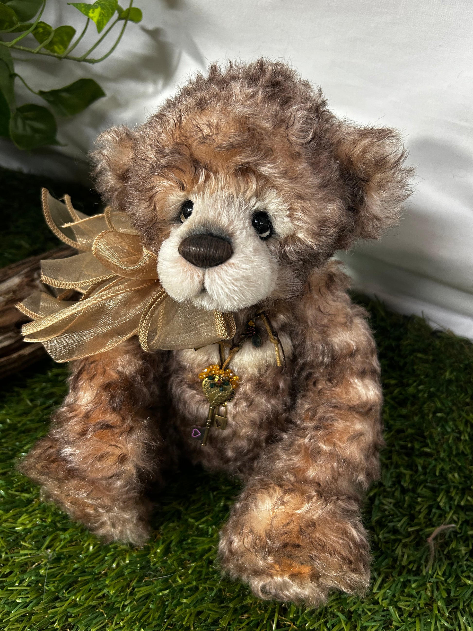 Camelot is an a-paw-able petite bear made from gorgeous brown curly mohair and alpaca. He has a dark brown hand-embroidered nose, a lightly trimmed off-white muzzle with airbrushing, the signature "who me" look, and flat paw pads. He wears a paw-geous double organza bow around his neck, as well as a key to your heart necklace. Numbered limited-edition of 300