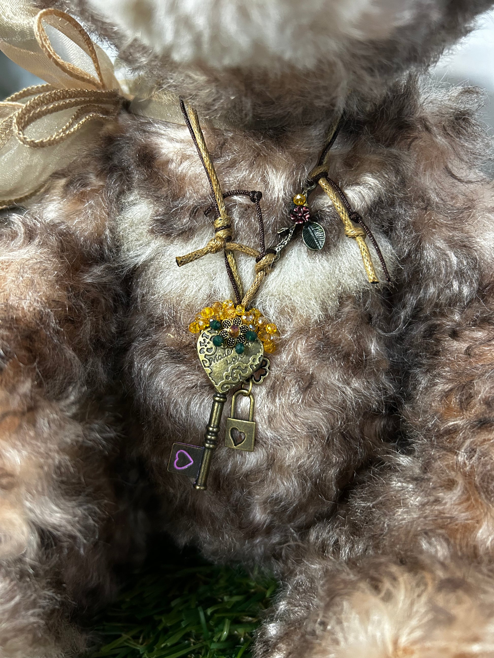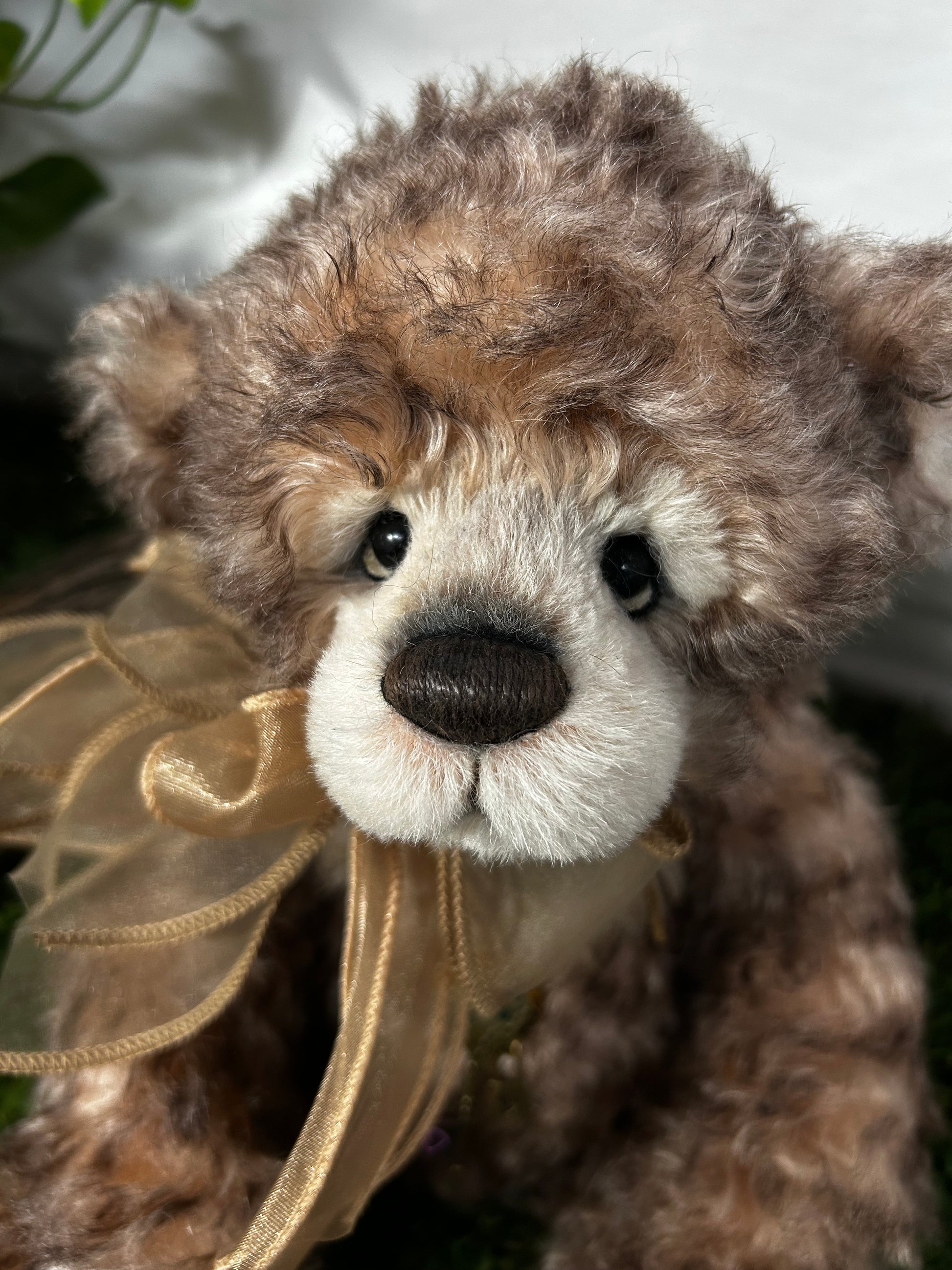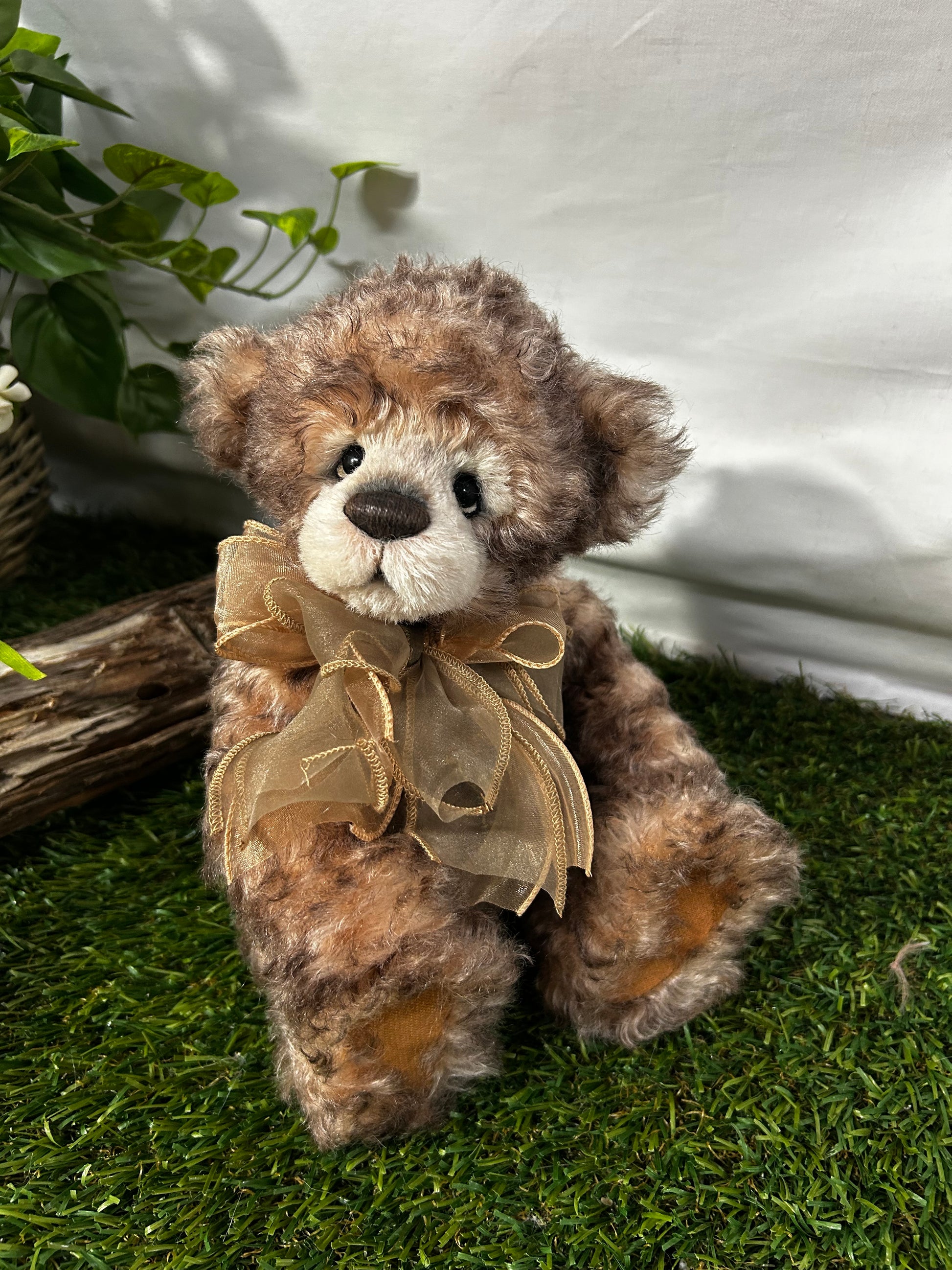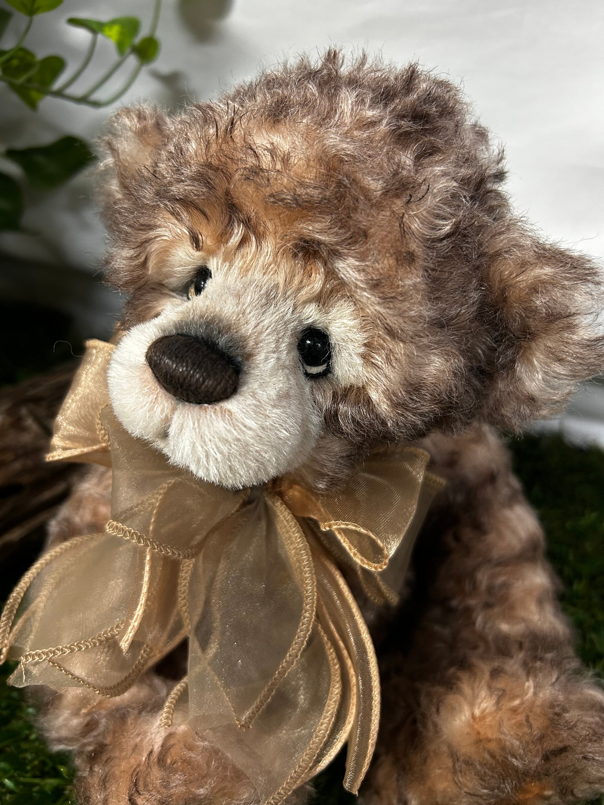 Camelot is an a-paw-able petite bear made from gorgeous brown curly mohair and alpaca. He has a dark brown hand-embroidered nose, a lightly trimmed off-white muzzle with airbrushing, the signature "who me" look, and flat paw pads. He wears a paw-geous double organza bow around his neck, as well as a key to your heart necklace. Numbered limited-edition of 300