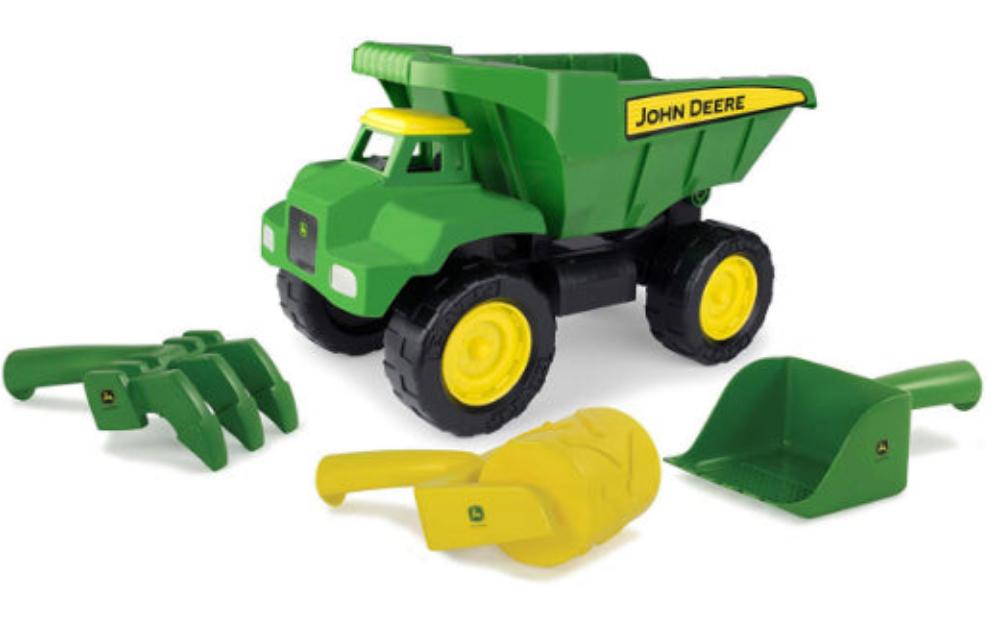 The John Deere big scoop dump truck is sand box tough and ready for loads of adventure. This 4-piece set includes (3) John Deere sand tools; a scoop with sifter, hand tiller and a tractor wheel pattern roller. The 15" dump truck features an easy-grip handle to tilt big loads out of the dump bed. Get ready for fun in the sun and sand with big scoop!