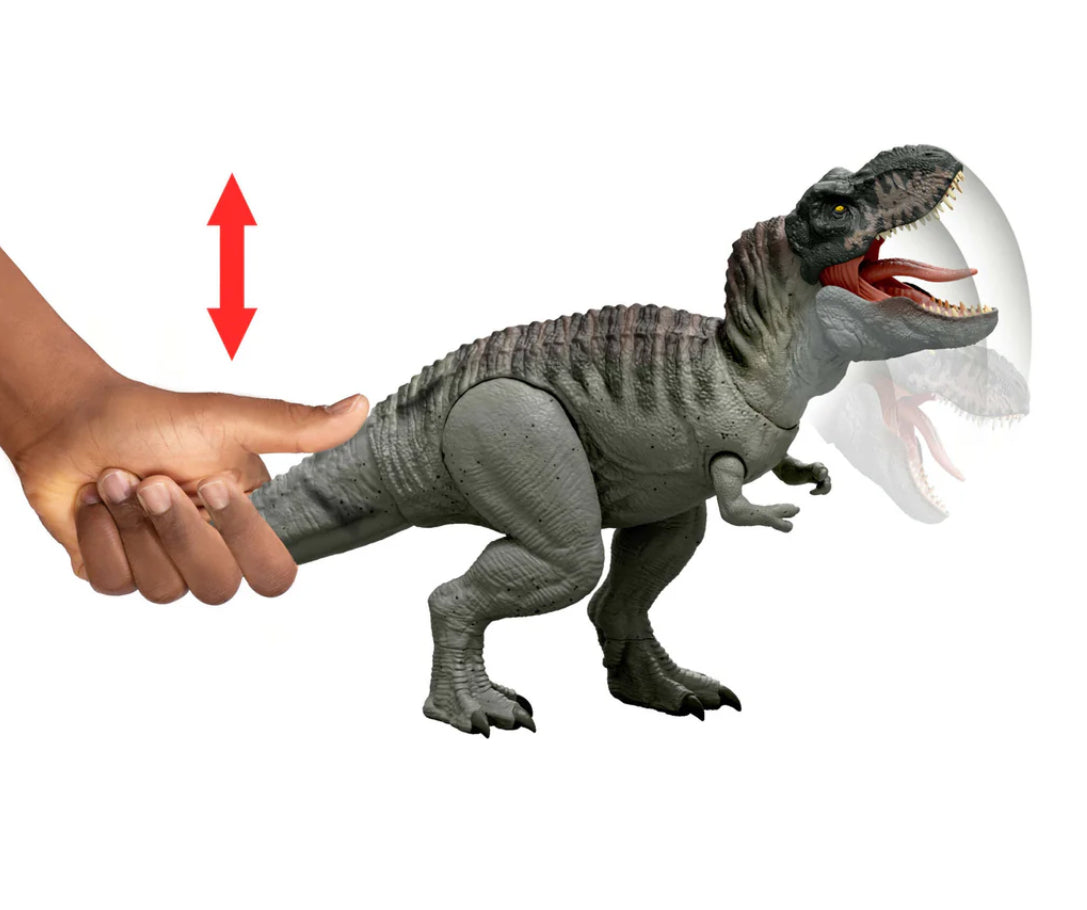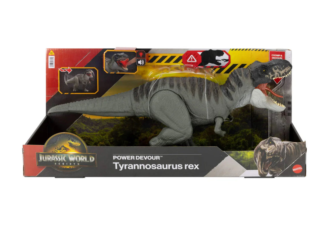 This Power Devour Tyrannosaurus rex inspired by Jurassic World Rebirth has a ferocious repeating chomp feature! When the tongue is pressed down, there’s an initial victory roar. When the tongue is held down longer, it activates a fierce continuous frenzy of chomping action with lights and sounds! This feature can provide action-filled battle play as the T. rex chomps on other dinosaur figures! Manipulating the tail moves the head up and down or side to side with the huge jaw opened wide! Scan the Tracking Code on the dinosaur’s foot in the free Jurassic World Play App with a compatible smart device (Android or iOS, not included) to unlock a digital version of the dinosaur and play the fiercely fun game to race various vehicles on land, air and sea.