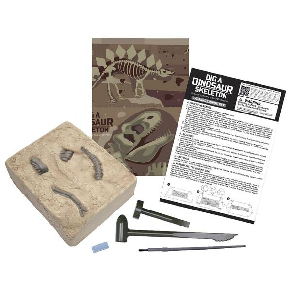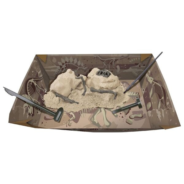 - Included in the box is a set of bones in a plaster block, a hammer and chisel and a 44 cm digging tray.