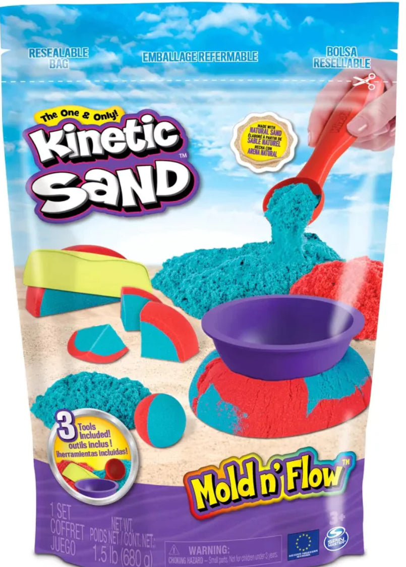 Kinetic Sand Mold n' Flow Discover endless possibilities with the Kinetic Sand Mold n' Flow playset! This Kinetic Sand kit features 1.5lbs of red and teal Kinetic Sand that's ready to mould, shape, and create. With 3 included Kinetic Sand tools – a dome, a knife, and a scoop – kids can unleash their creativity and enjoy hours of open-ended play. The magic of Kinetic Sand is that it sticks together for easy shaping and clean-up, providing hours of mess-free fun.