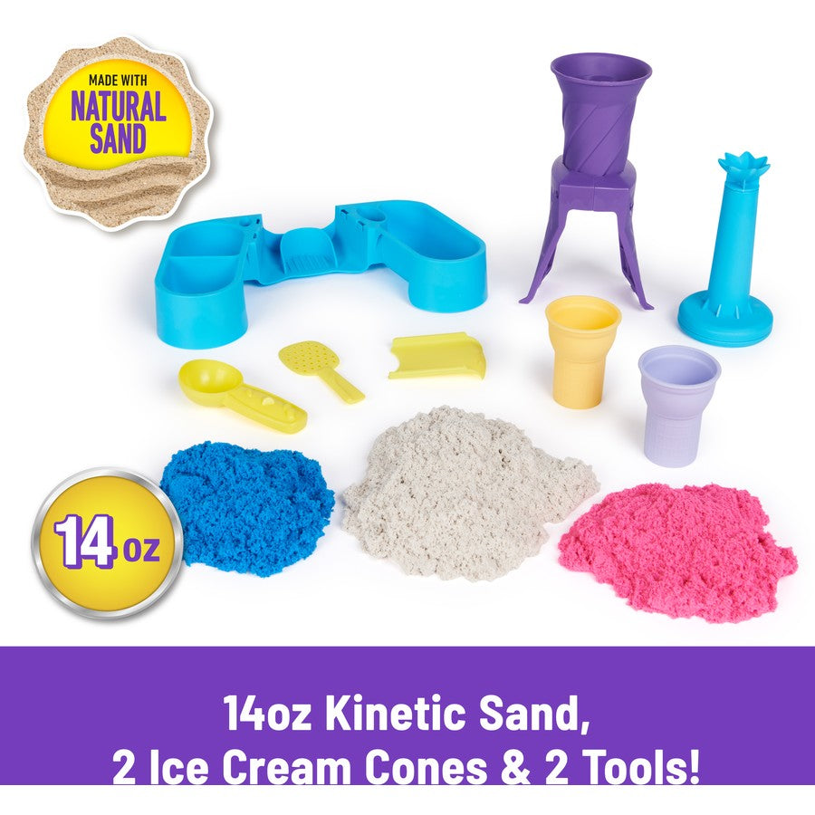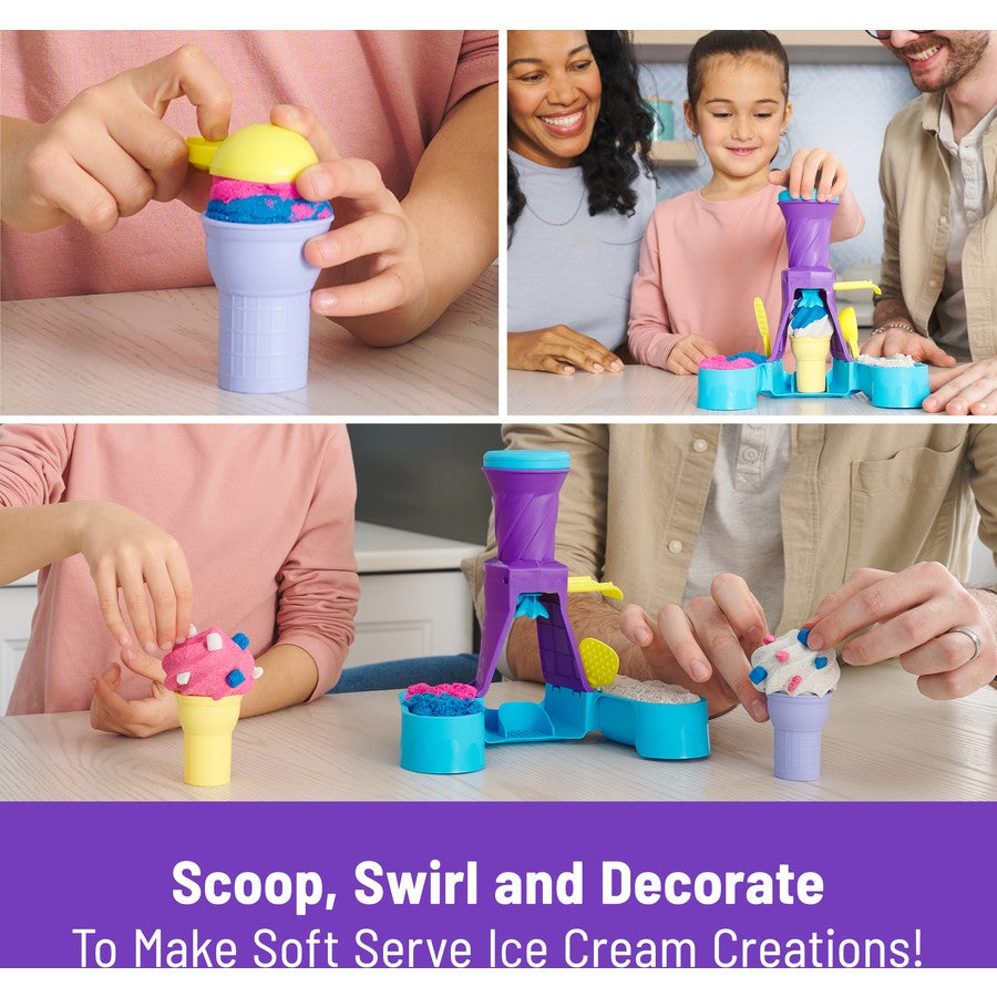 Swirl and create with the Kinetic Sand Soft Serve Station! For the first time, kids can swirl Kinetic Sand to mimic a soft serve ice cream experience like they’ve seen in the real world! With 14oz of blue, pink, and white Kinetic Sand, two ice cream cones and tools like a scoop with sweet treat molds and sprinkle grater, your child can serve up endless ice cream possibilities. Scoop classic cones or create the ultimate swirl. Flow sand into the station, push down to swirl Kinetic Sand into the cone, and remove to decorate! Add some sprinkles and extra toppings, then squish and create all over again! The One and Only Kinetic Sand is made from natural sand that sticks to itself for easy cleanup! It never dries out. Let it flow through your hands – it’s so satisfying, you won’t be able to put it down!