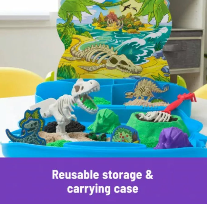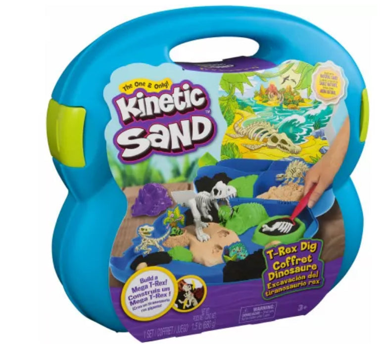 Build a dinosaur world with the Kinetic Sand T-Rex Dig! This set includes 1.5lbs of Kinetic Sand in 3 colors (natural brown, black and neon green), 5 fossils that double as multipurpose tools, a shovel, decorative cutouts, and a double-sided backdrop. T-Rex Dig will spark endless imaginative pretend play as kids use the shovel to dig and rake for hidden treasures! Each T-Rex fossil has a unique sand feature: stamp footprints, rake with the claws, slice the sand with the tail and mold eggs with the ribs! Kids can decorate and transform their set into a prehistoric world with the backdrop and connect the fossils to build a mega T-Rex! After play, pack everything into the storage case. The One and Only Kinetic Sand is made from natural sand that sticks to itself for easy cleanup. Create again and again and let it flow through your hands – it’s so satisfying, you won’t be able to put it down! An alternative to arts and crafts modeling clay, Kinetic Sand is a welcome addition to the sensory bin, activities time and Montessori toys. Kinetic Sand promotes fine motor skills and creativity through independent tactile play. Bring home Kinetic Sand Rainforest Kingdom!